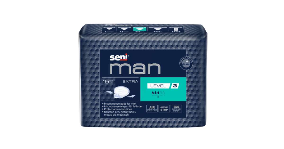 A Seni Man Extra Level 3 inkontinencia betétet az aktív életmódot folytató, kényelmet, biztonságot és diszkréciót kedvelő férfiak számára készítették. Egy átlélegző betét, mely hatékony védelmet nyújt az enyhe vagy mérsékelt vizeletinkontinenciával érintett férfiak számára. A férfiak anatómiájához tervezett, homorú forma. A termék nedvszívó rétegében lévő polimerek, a szuperabszorbens összetevő, a nedvességet hatékonyan megköti, így nedves környezet hiányában nem tudnak szaporodni azon baktériumok, melyek a kellemetlen vizeletszag terjedéséért felelősek. Egyszerű a felhelyezése, ugyanis a betét ragasztócsíkokkal rögzíthető (egyszer a betét közepén, ill. további két ponton az oldalakon, a felső szélen). Az alkalmazott anyagoknak köszönhetően a bőr szabadon lélegezhet. Latexmentes termék, a latex ugyanis allergizálhat az arra érzékenyeknél. Egy puha betét, amely nem zörög, és gyengéd a bőrhöz.