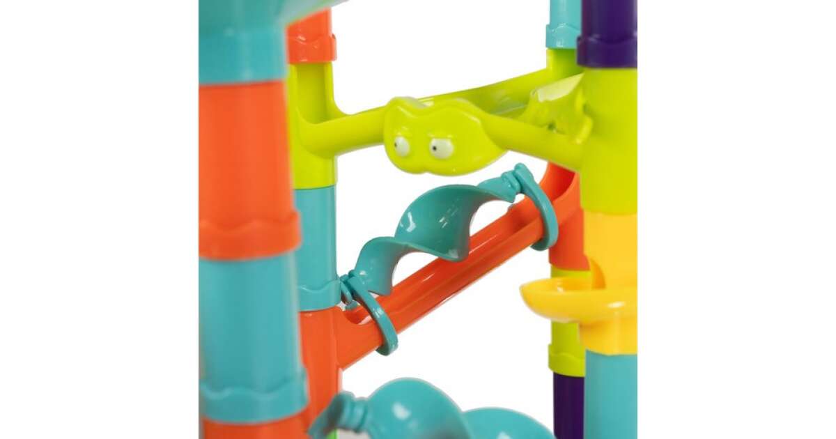 Ez a vidám, színes labda pálya csúszda garantáltan órákig leköti gyermeke figyelmét! 113 elemből álló, több mint 30 színes golyóval érkezik, melyek vidáman gurulnak a pályán. A különböző alakzatok és a csúszdák fejlesztik a gyermek finommotorikus képességeit, térbeli látását és problémamegoldó készségét.
