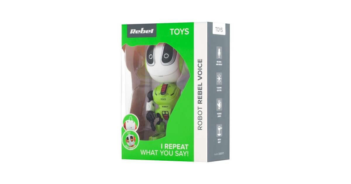 Ez a vidám, zöld színű interaktív robot tökéletes játék a gyerekeknek! A Rebel Robot Voice meghallgatja a gyermeked szavait, majd vicces torzítással megismétli őket. Ez fejleszti a képzelőerőt és a beszédkészséget. A robot mozgatható karokkal és lábakkal, valamint ragyogó szemekkel rendelkezik, ami még szórakoztatóbbá teszi a játékot.