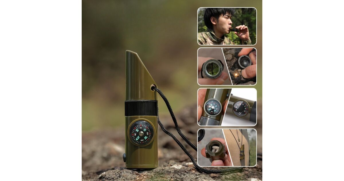 KeepHome túlélőkészlet, többfunkciós síp 7 az 1-ben, túrázáshoz, túrázáshoz, nagyító, síp, hőmérő, tablettatároló, iránytű, ABS anyag, zsinórral, 9,7 x 2,8 cm, zöld