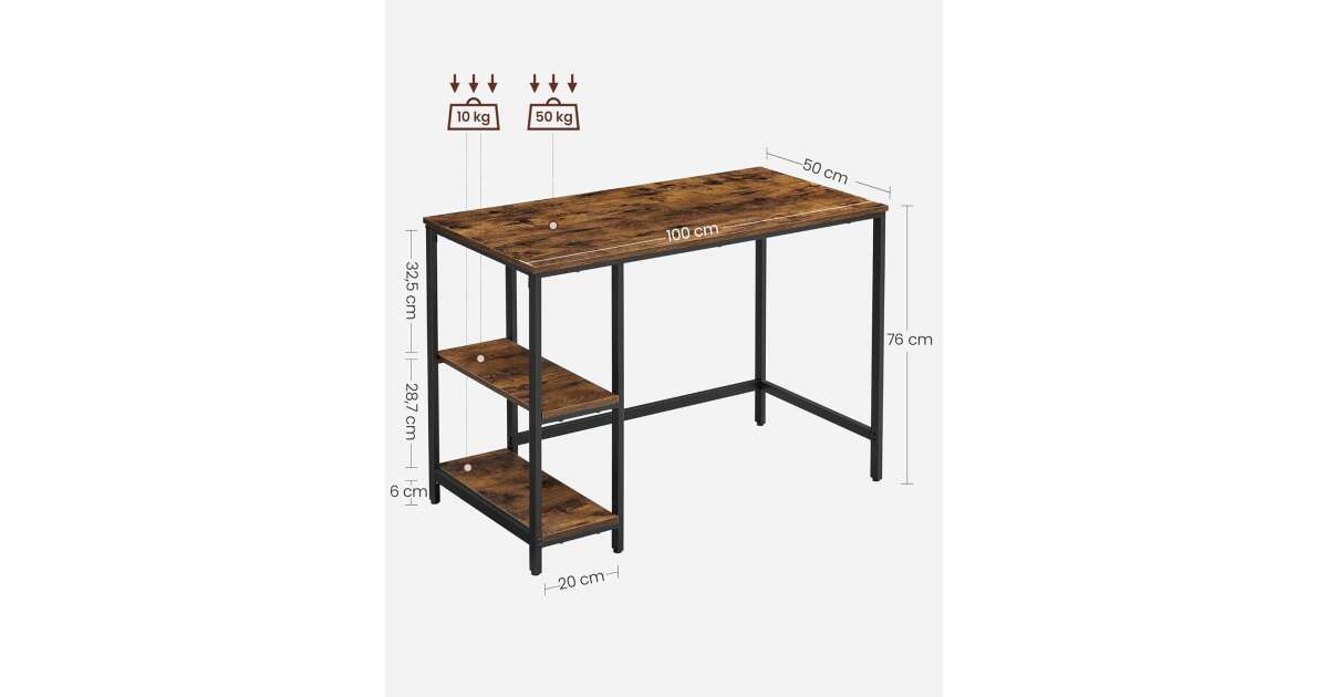 Ez a VASAGLE íróasztal tökéletes választás mindazoknak, akik stílusos és funkcionális munkahelyet szeretnének otthonra. A rusztikus barna és fekete színkombinációja modern ipari megjelenést kölcsönöz, míg a két polc elegendő helyet biztosít a dokumentumok, könyvek és egyéb irodai kellékek tárolására.
