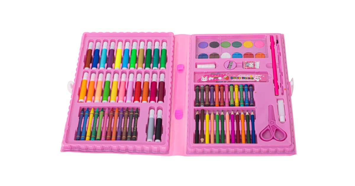 Ez a 86 darabos műanyag festőkészlet minden kis művész álma! Praktikus, rózsaszín bőröndben érkezik, így könnyen magaddal viheted bárhová. Képzeletednek csak a határ szabhat határt! 🎉