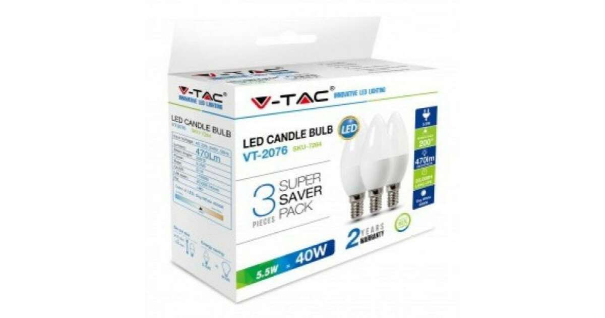 V-TAC 4.5W E14 természetes fehér gyertya LED égő csomag (3 db) - SKU 217264