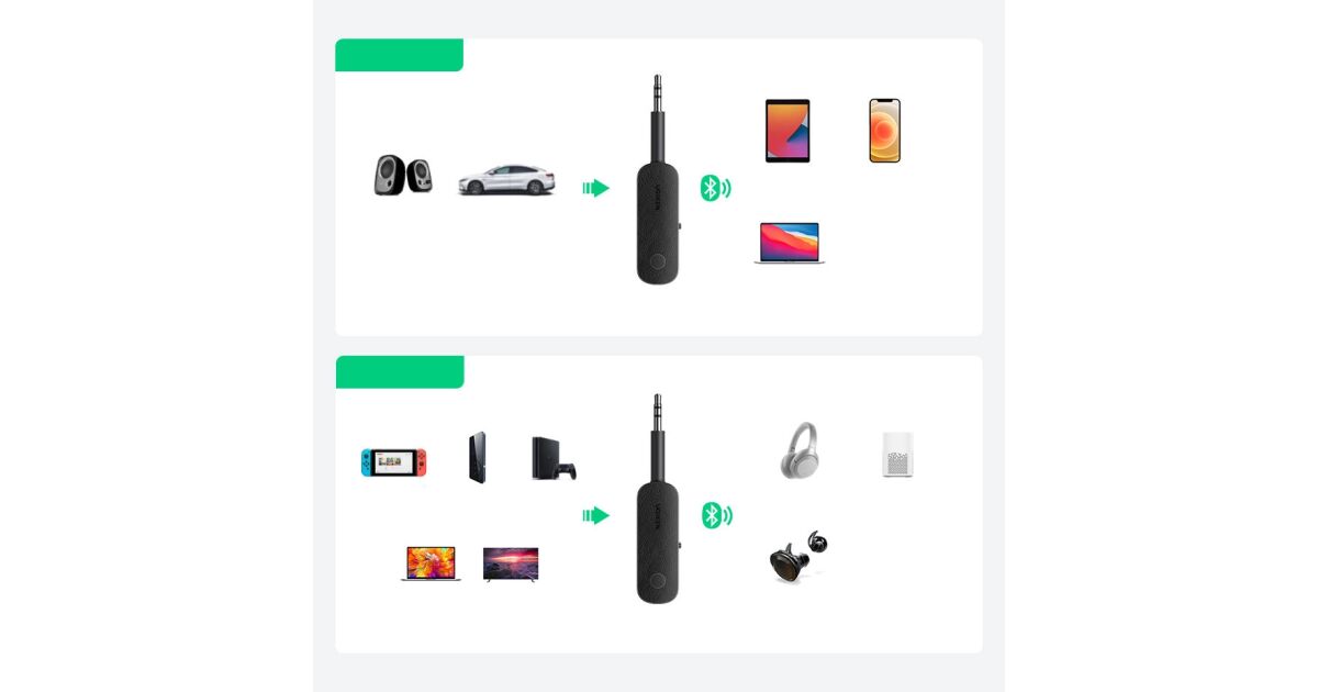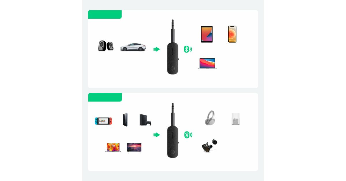 Ezt a terméket így is ismerheted: Bluetooth vevő/adó, UGREEN, CM403, Bluetooth 5.0, AUX 3,5 mm, fekete, hatótávolság 10 m, autonómia 8 óra
