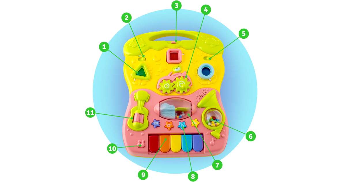 - Fejlesztő játékok: Zongora, fogaskerekek, csörgők, világító alakzatok és 10 vidám dal szórakoztatják a babát. 🎹