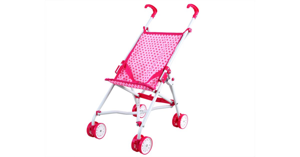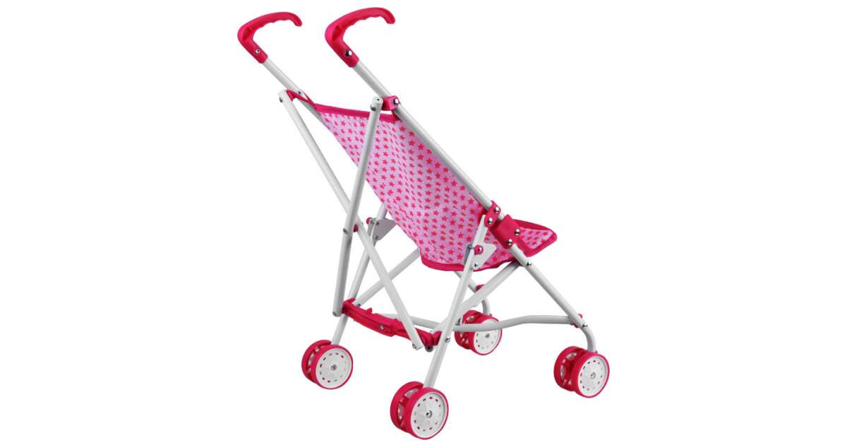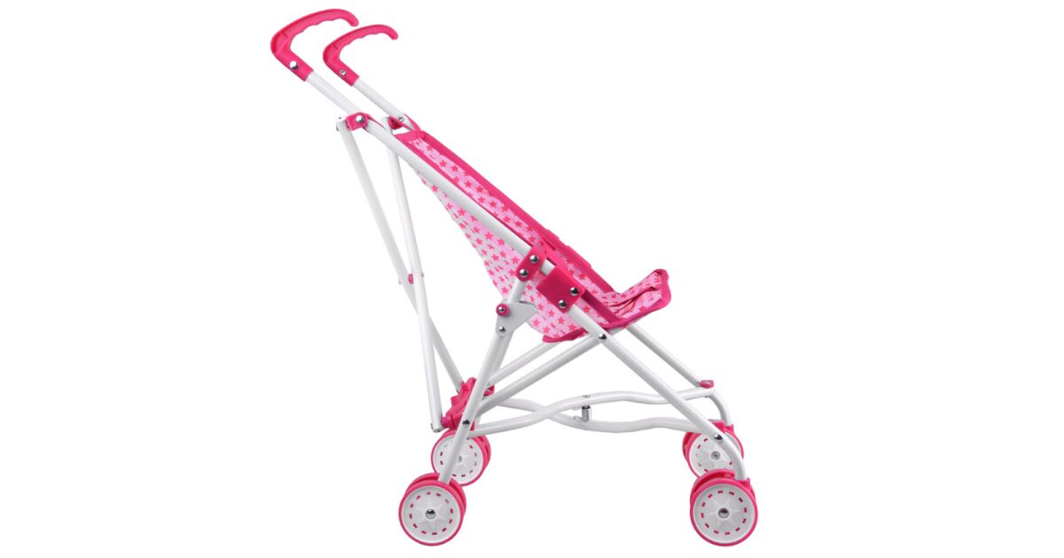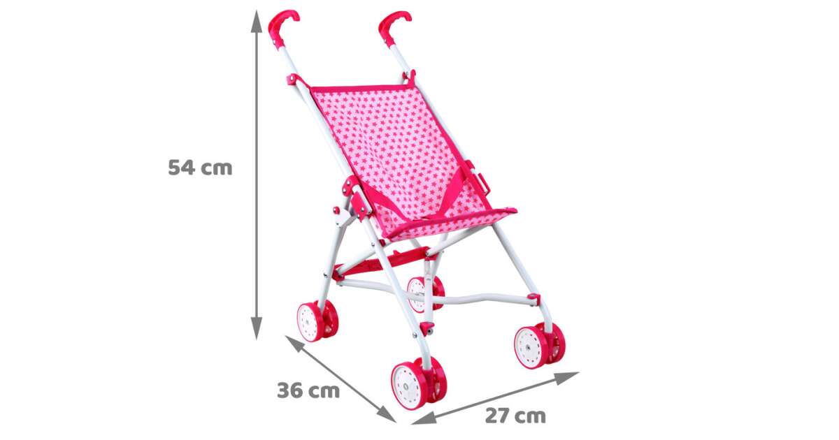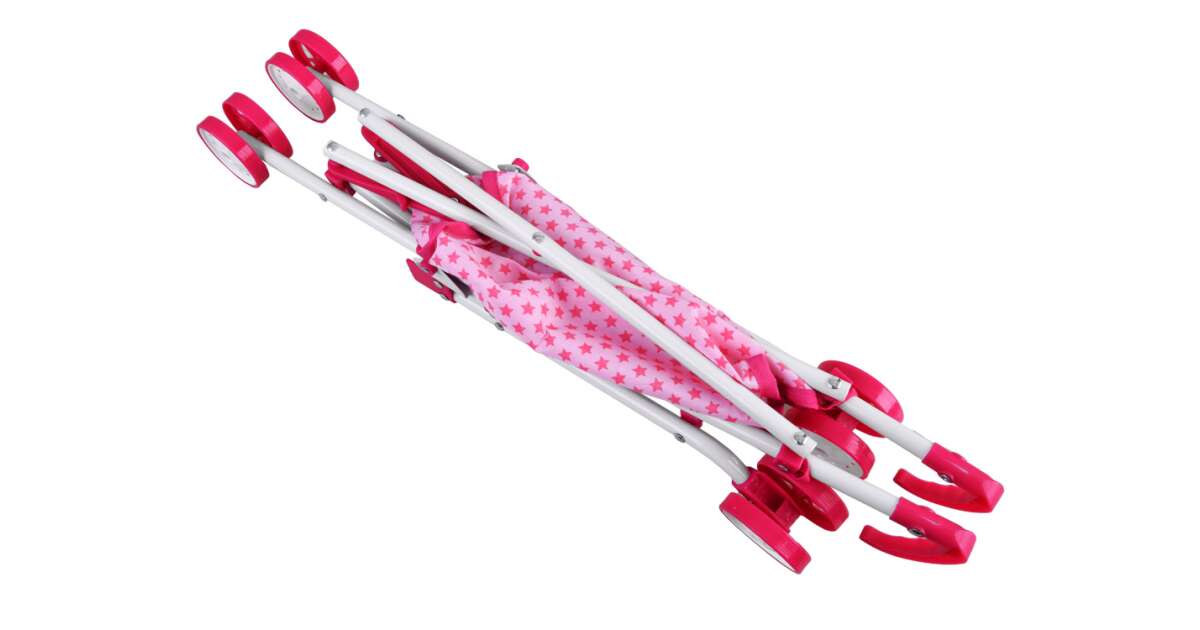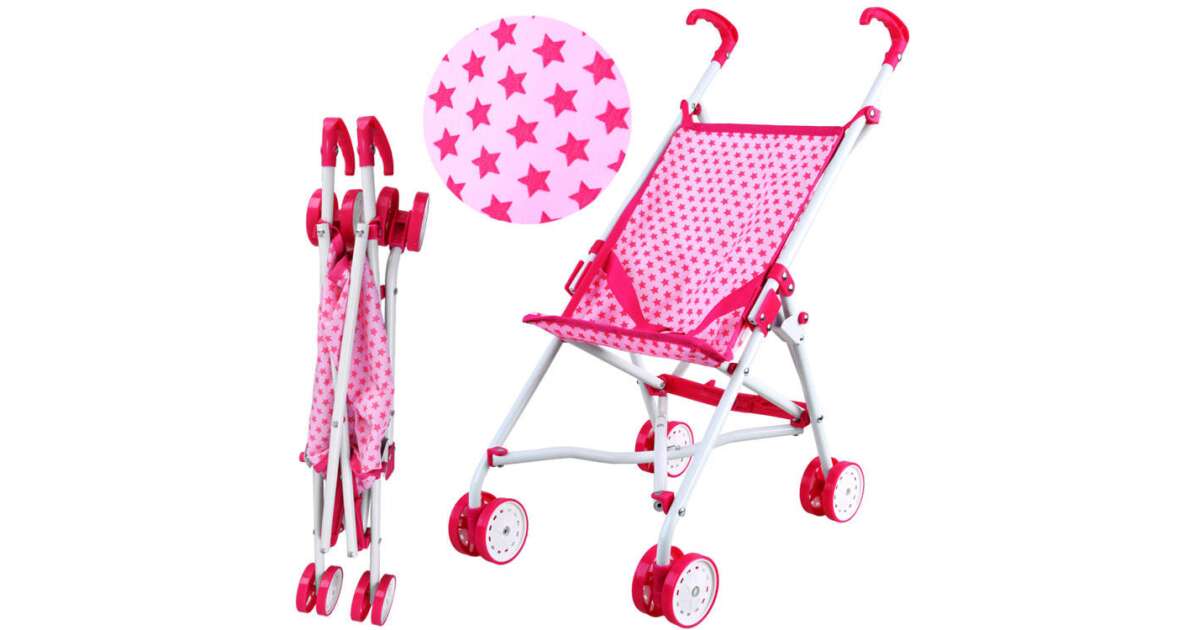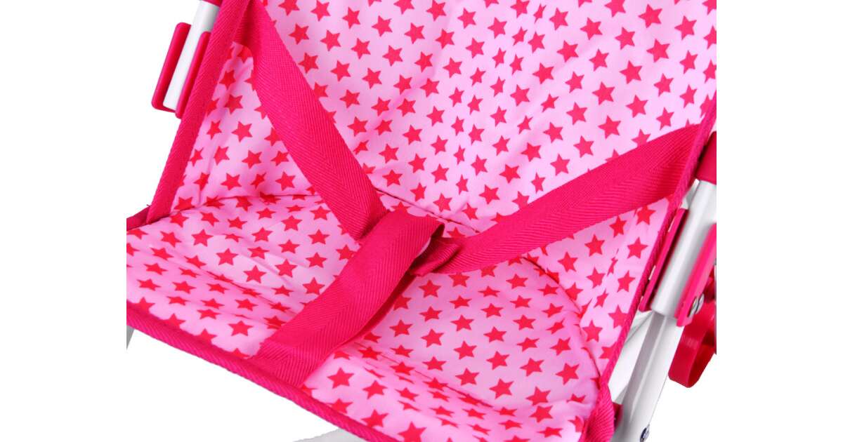 Ez a bájos, rózsaszín, csillagos mintás esernyőre csukható babakocsi tökéletes választás a kislányoknak, hogy babáikat és plüssállataikat kényelmesen sétáltathassák. Könnyű, biztonságos és könnyen kezelhető.