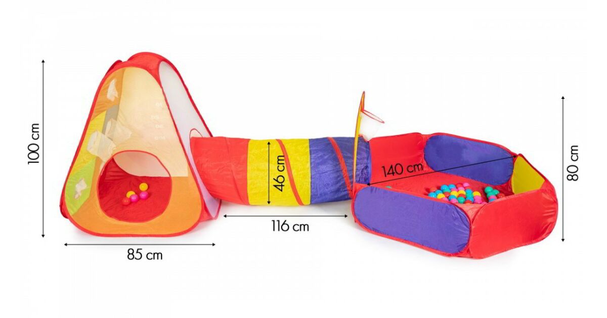 - Nagy méret: A kinyitott sátor mérete: 100 × 120 × 300 cm, így akár több gyermek is elfér benne egyszerre. (A vevők tapasztalatai szerint még felnőttek is belebújtak az alagútba!)
