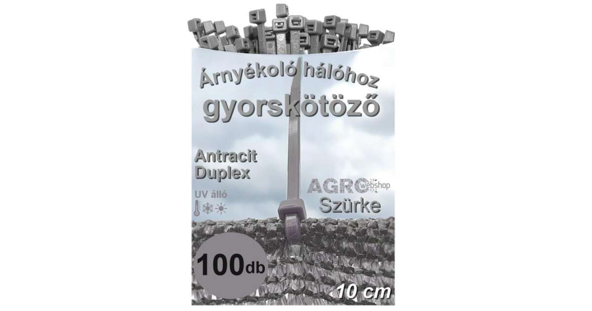 Erős, szürke műanyag kötegelő bilincs, ideális árnyékoló hálók rögzítéséhez. 100 darabos kiszerelésben, 10 cm hosszúsággal. Gyors és egyszerű megoldás a háló biztonságos rögzítésére.
