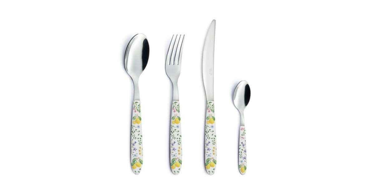 A gyönyörű virágos-citromos mintázat vidámságot visz az asztalhoz, emellett a rozsdamentes acél garantálja a tartósságot és a könnyű tisztíthatóságot. A kényelmes műanyag nyél pedig biztosítja a kellemes étkezési élményt.