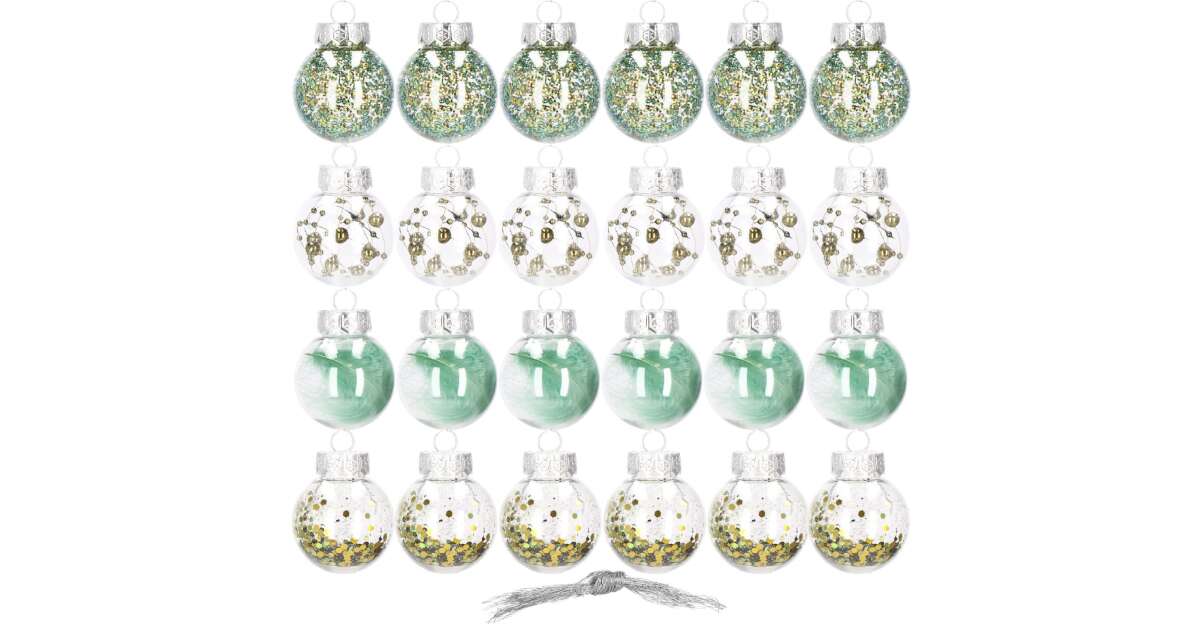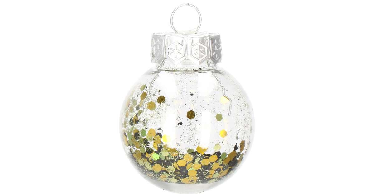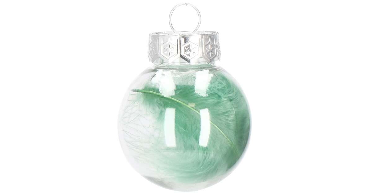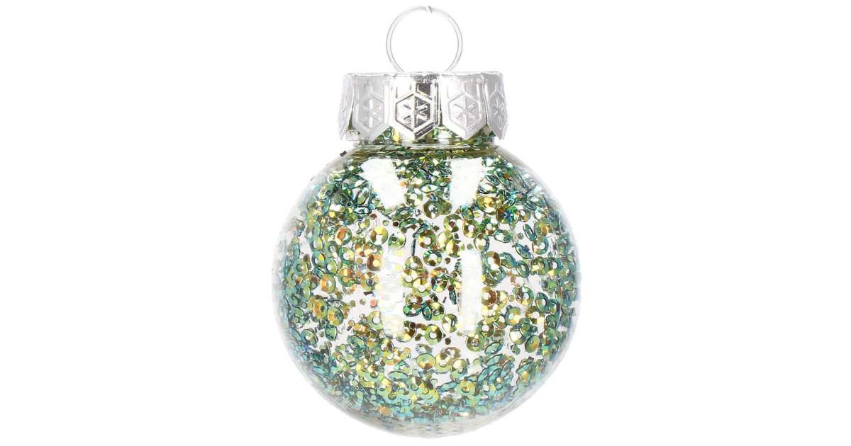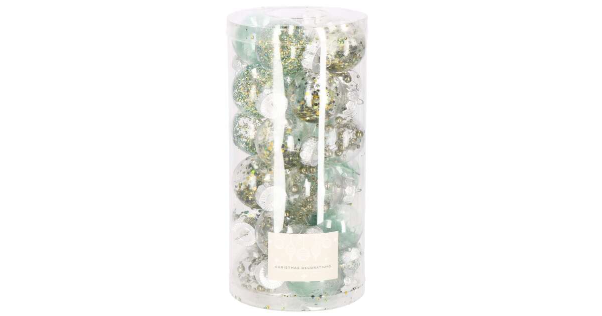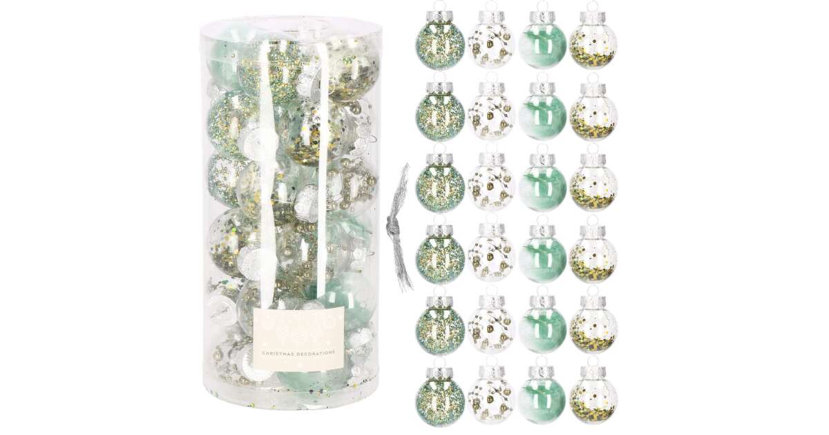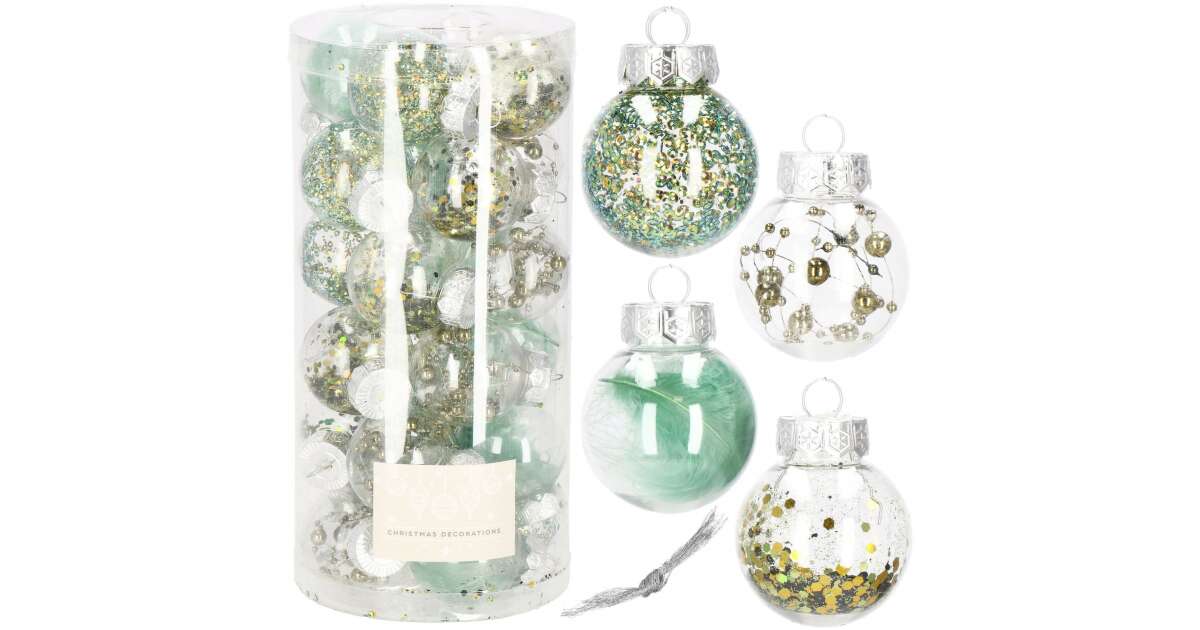 Ez a 24 darabos karácsonyfadísz készlet 5 cm-es, átlátszó gömbökből áll, melyek arany és zöld színűek, és különböző mintákkal vannak díszítve: toll, gyöngyök, flitterek és konfetti. A gömbök műanyagból készültek, így törhetetlenek, és biztonságosan használhatók akár gyermekes családokban is.