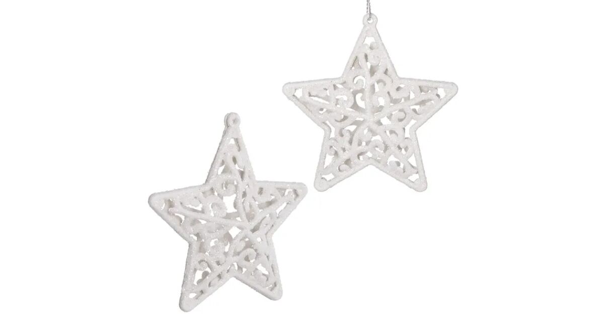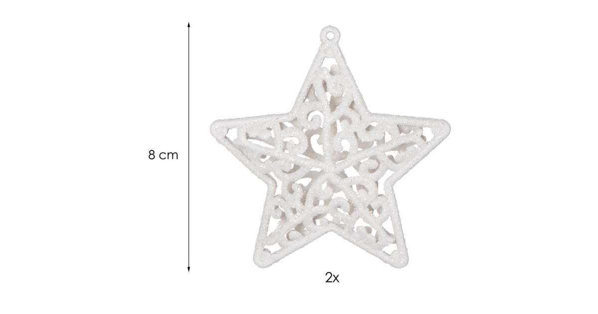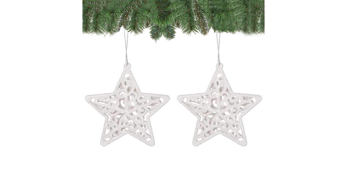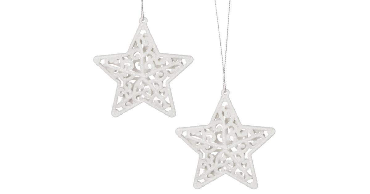 Két gyönyörű, fehér csillámokkal díszített karácsonyfadísz, melyek garantáltan feldobják az ünnepi hangulatot! Ezek a törhetetlen műanyag csillagok tökéletesek a karácsonyfa díszítéséhez, és évekig örömöt okoznak majd.