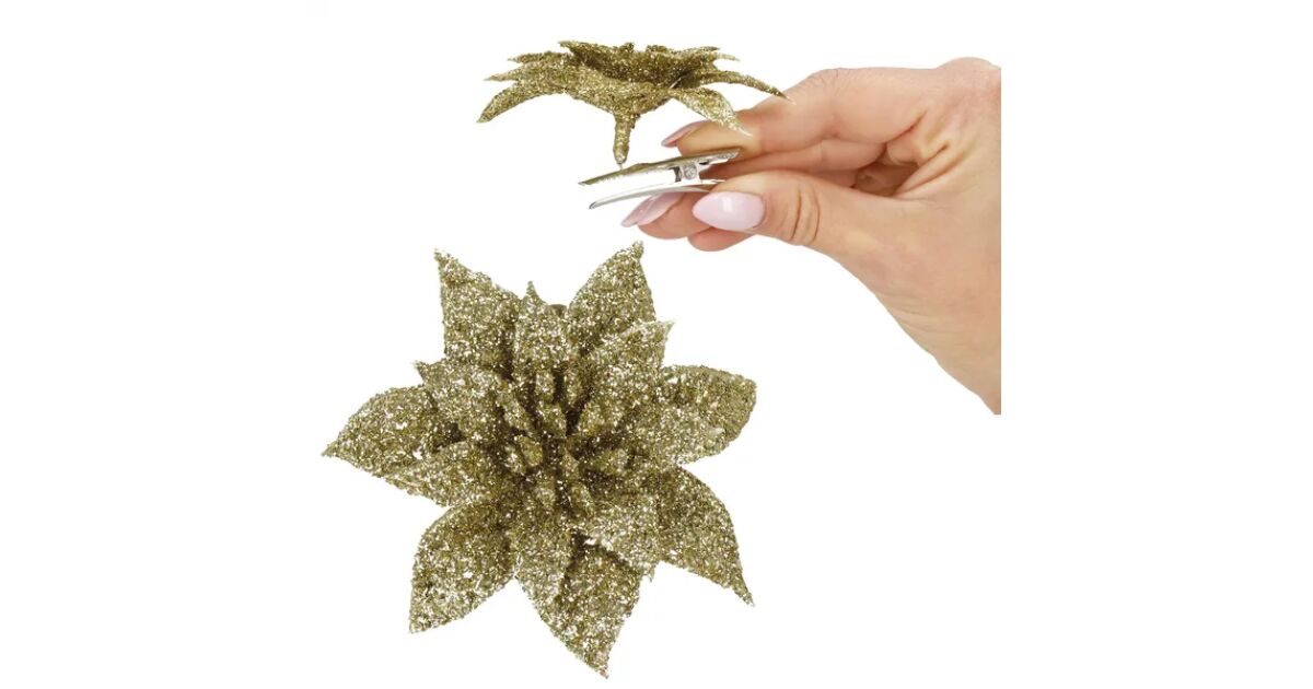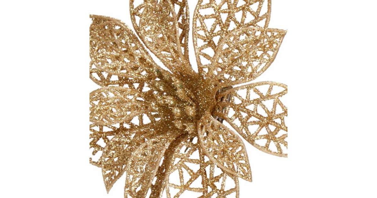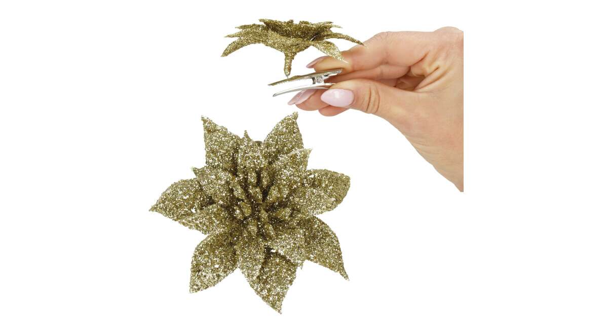 Ezzel a gyönyörű, arany csillogású mikulásvirággal varázsolhatsz ünnepi hangulatot karácsonyfádra! A finom csillogás és az elegáns forma tökéletes kiegészítője lesz karácsonyi dekorációdnak. Könnyen felhelyezhető a praktikus csíptető segítségével.