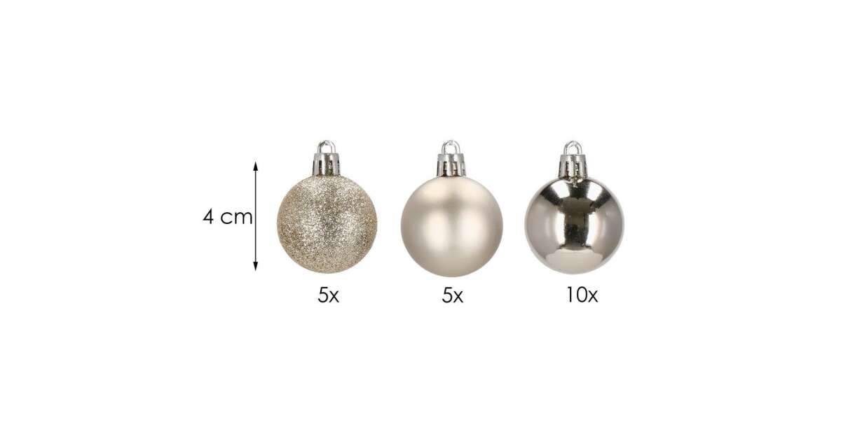 Díszítsd fel karácsonyfád ezekkel a gyönyörű, 4 cm-es karácsonyfadíszekkel! A készlet 20 db törhetetlen műanyag gömböt tartalmaz, háromféle felületkezeléssel: matt, csillogó és fényes. A pezsgő és ezüst árnyalatok elegáns és ünnepi hangulatot teremtenek otthonodban.