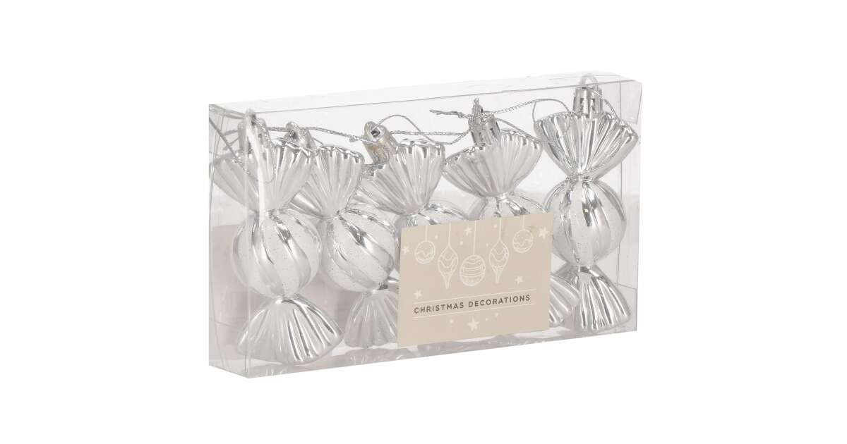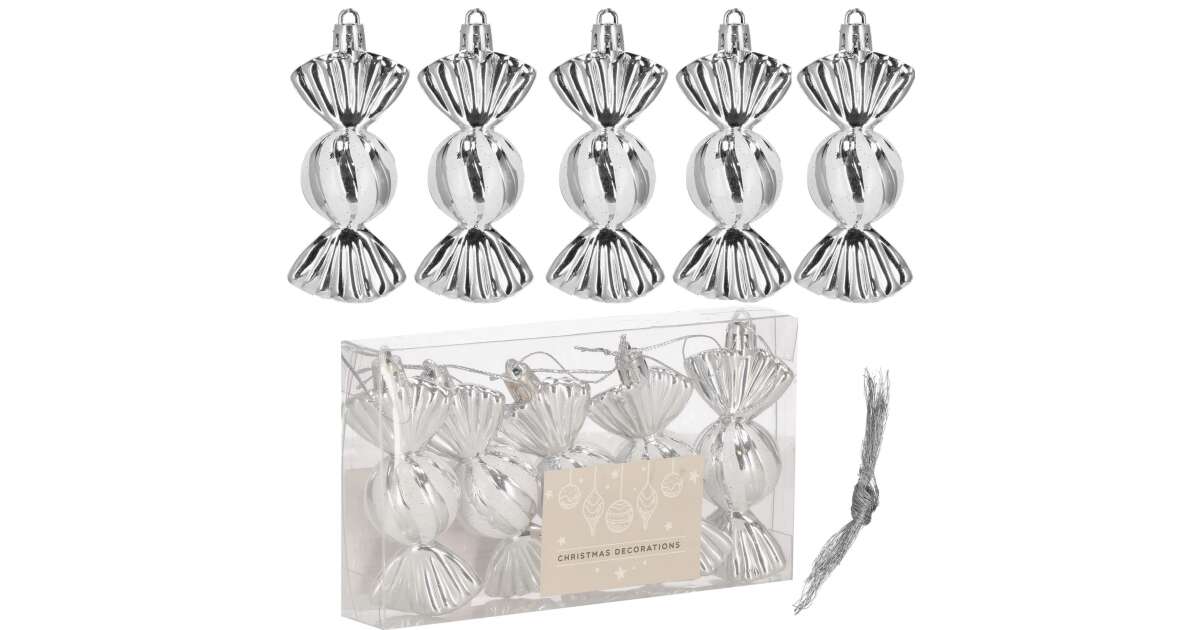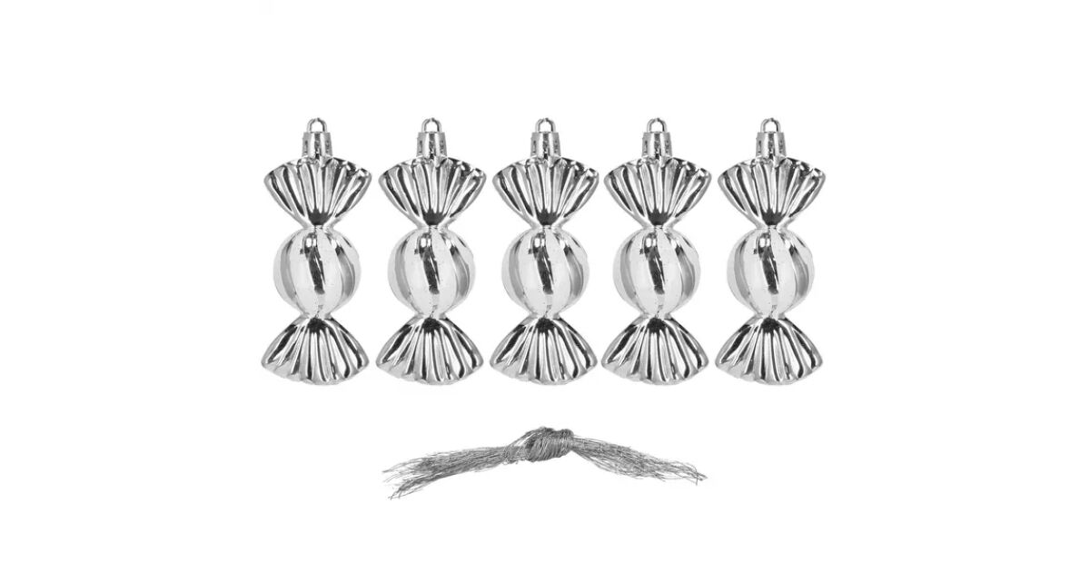 Elegáns és ünnepi hangulatot varázsol otthonába ez az 5 darabos, ezüst színű karácsonyfadísz-szett. Minden dísz egy-egy csillogó cukorkát formáz, melyek tökéletes kiegészítői lesznek karácsonyfájának. ✨