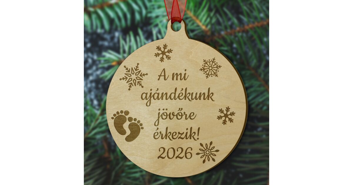 Ezt a terméket így is ismerheted: Gyerek bejelentő ajándék szülőknek, A mi ajándékunk jövőre érkezik gravírozott karácsonyfadísz fából