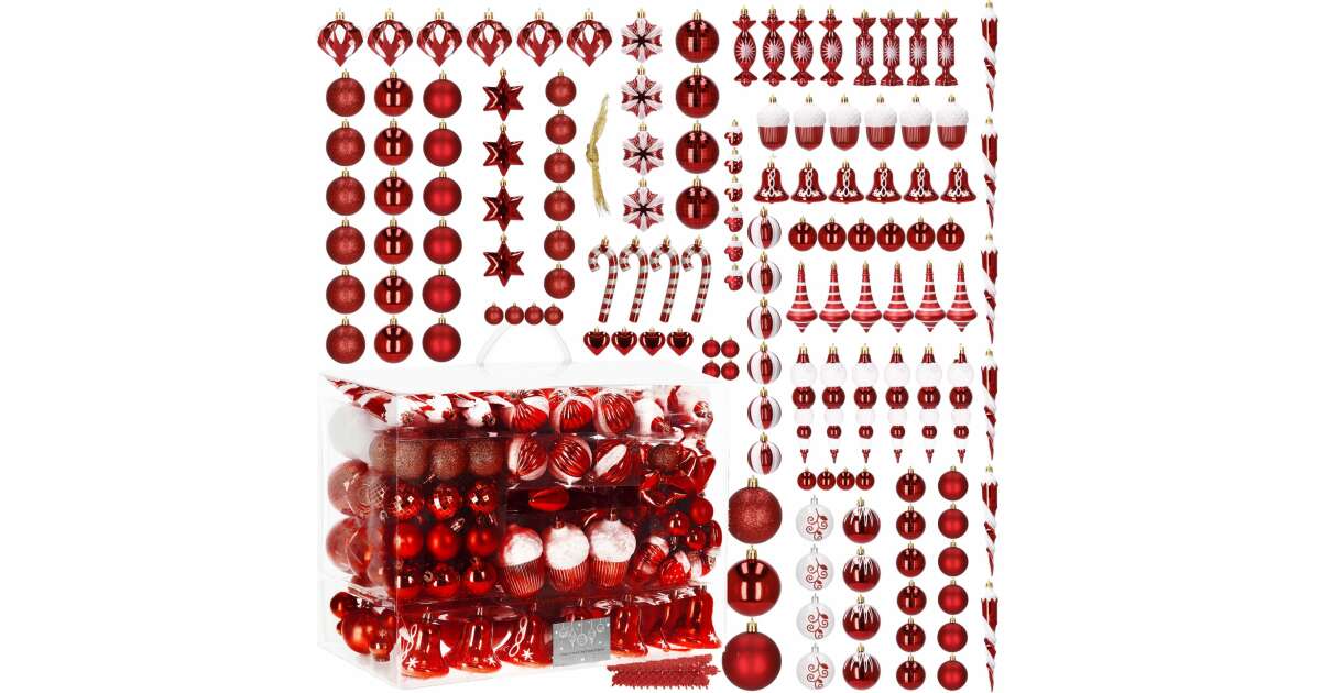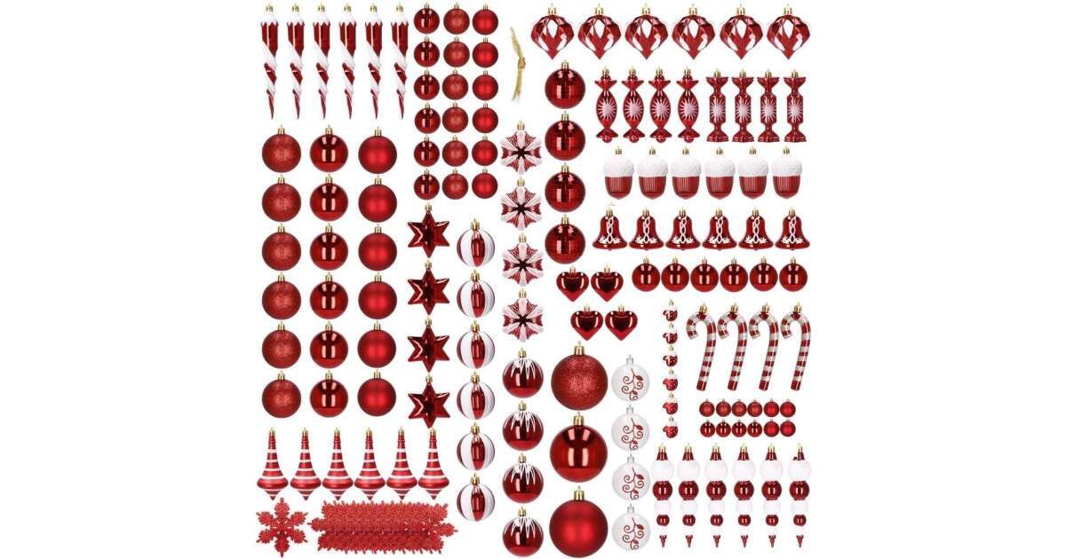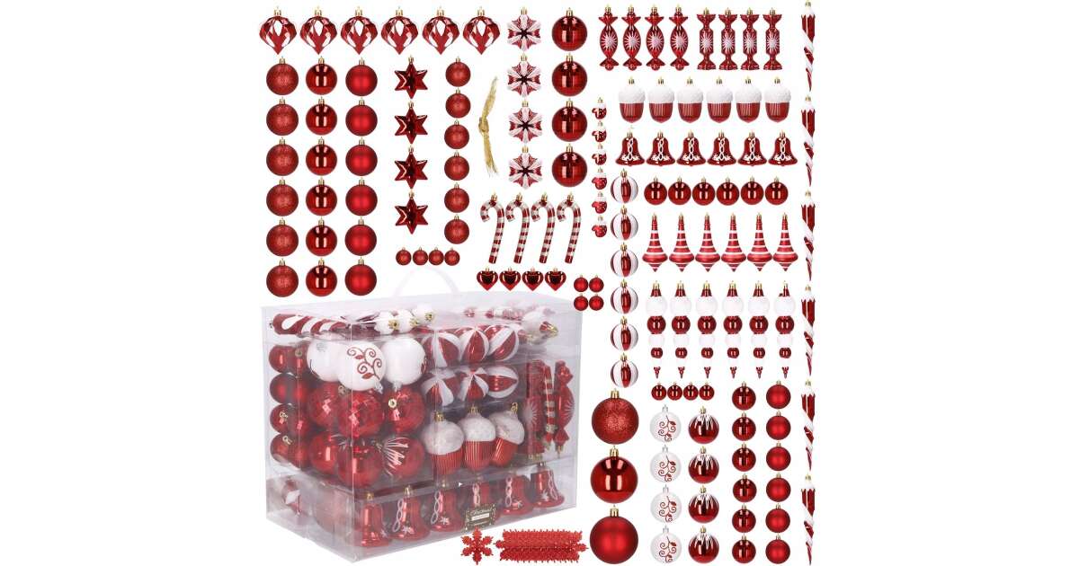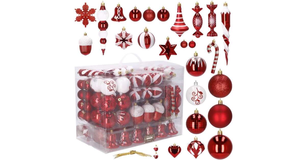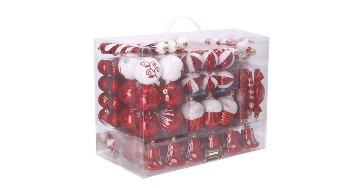 Ez a 155 darabos karácsonyi díszszett piros és fehér árnyalatokban pompázik, 22 egyedi mintával. Tökéletes választás, ha egyedi és ünnepi hangulatot szeretnél teremteni a karácsonyfán! ✨