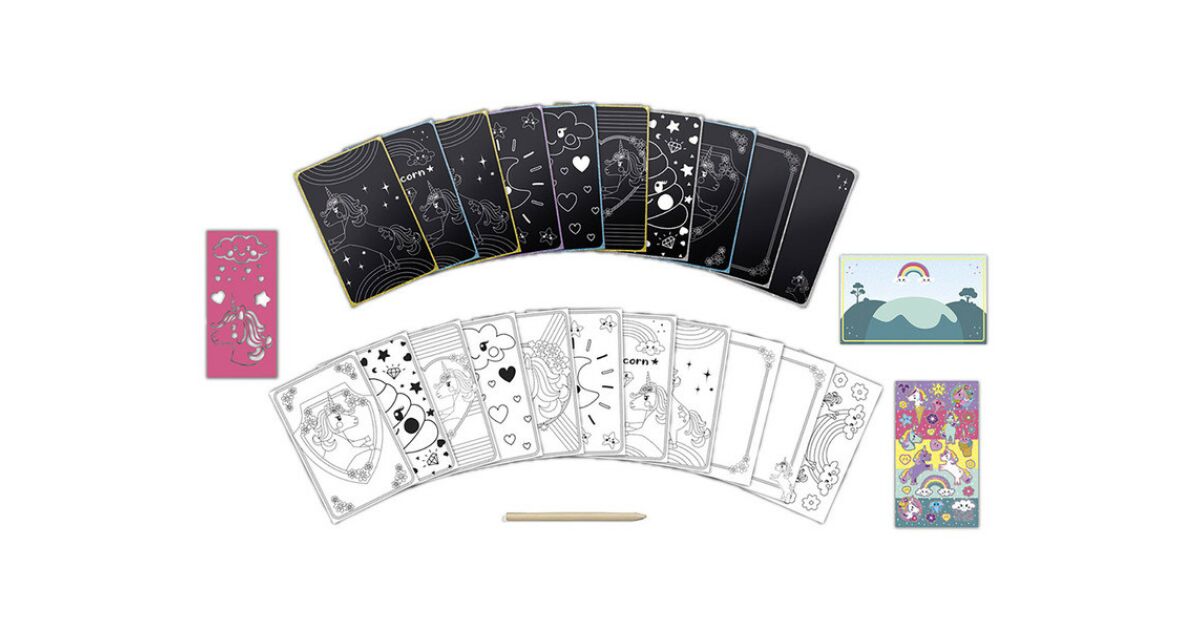 Fedezd fel a kreativitásod ezzel a fantasztikus kaparós kifestővel! 10 db fekete kaparó táblán varázsolhatod elő a rejtett egyszarvús motívumokat egy fa kaparóeszközzel. A készletben 11 db színező lap is található, hogy még színesebbé tedd a képeidet! Dekorációval és matricákkal is feldobhatod a műveidet. Készíts egyedi egyszarvús történeteket!