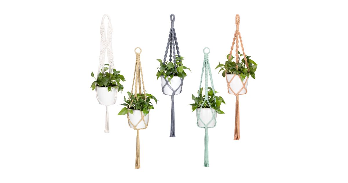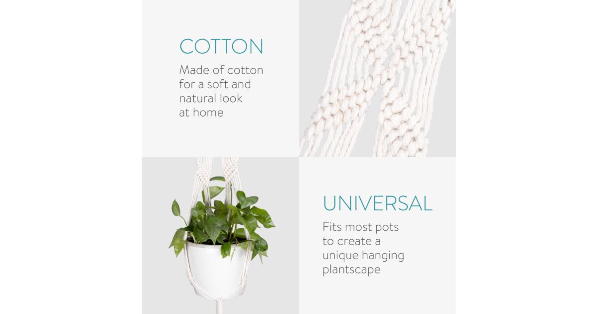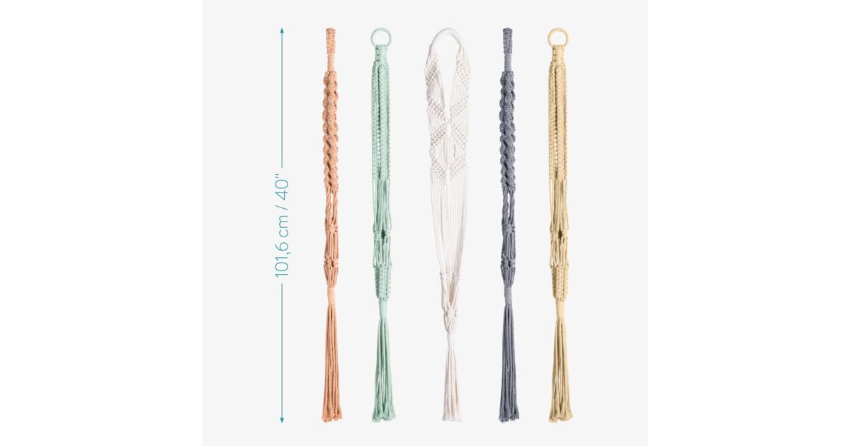 Navaris makramé virágtartók – 5 darabos szett – Pamut függőtartók – Hossz 101 cm – Beltéri vagy kültéri használatra Bohém stílus a növényeidnek Adj egy csipetnyi természetes eleganciát otthonod dekorációjának ezzel az 5 darabos Navaris makramé függőtartó készlettel. Pamutból készült, különböző stílusokban és színekben kapható tartók, amelyek kiemelik kedvenc növényeidet, beltéren és kültéren egyaránt. Bohém és modern dizájn A készlet 5 db pamut makramé akasztót tartalmaz, három különböző stílusban és színben. A pamut természetes textúrája a növények zöldjével kombinálva harmonikus megjelenést kölcsönöz, modern és retró díszítésekkel - tökéletes bármilyen belsőépítészethez. Beltéri vagy kültéri használatra Zöld sarkot hozhatsz létre a nappaliban, a hálószobában, a teraszon vagy az erkélyen. Az állványok ideálisak bármilyen helyiség díszítésére, legyen szó beltérről vagy kültérről. Könnyű és gyors összeszerelés Minden tartó tetején egy hurok található, amely lehetővé teszi a könnyű felakasztást a mennyezetre vagy a falra. Különböző formájú és méretű edényekhez alkalmasak. Megjegyzés: a mennyezeti rögzítőkonzolok nem tartozékok. Sokoldalúság a dekorációban Az 5 tartóelemet kombinálhatod az egységes hatás érdekében, vagy használhatod őket külön-külön is, a ház különböző sarkaiban. Ideálisak olyan növényekhez, mint a borostyán, páfrányok, pozsgások vagy más kúszó fajok. Specifikációk • Anyag: pamut • Hossz: 101 cm/db A csomag tartalma • 5 db függő növénytartó
