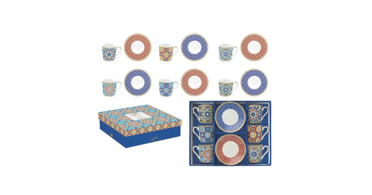 Élvezze kedvenc eszpresszóit stílusosan ezzel a gyönyörű 6 személyes porcelán csésze és alj szettel! A Marrakech kollekció lenyűgöző, színes mintái feldobják a reggeleit, és egyedi hangulatot kölcsönöznek a kávézásnak. Minden csésze 100 ml űrtartalmú, tökéletes adag az eszpresszóhoz.