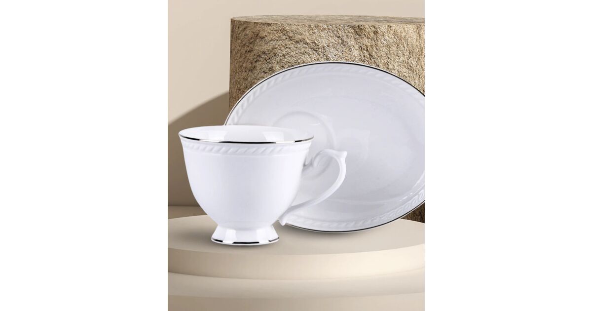 6 személyes készlet – 6 csésze + 6 alj Űrtartalom: 220 ml / csésze Díszdobozos kivitel – ajándékozásra kész Anyag: prémium porcelán Szín: fehér alap, elegáns aranyszegéllyel Klasszikus forma és hosszú életű dizájn