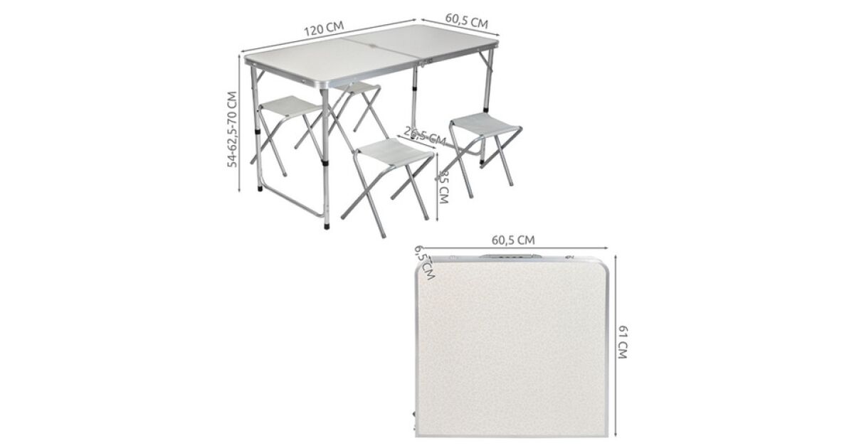 Ez az összecsukható kempingszett tökéletes a szabadtéri kalandokhoz, kényelmet és praktikumot nyújtva neked és családodnak. Ideális kempingezéshez, piknikekhez, kirándulásokhoz vagy akár kerti partikhoz! Gyorsan és egyszerűen felállítható, egy kompakt bőröndből egy funkcionális asztallá alakul 4 székkel.