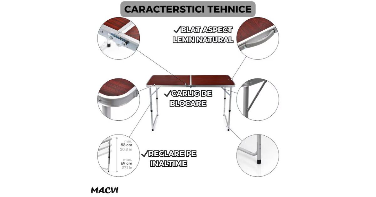 Macvi® Meteor összecsukható kempingasztal, könnyű alumínium, MDF lap 120x60 cm, állítható magasságú, bőrönd típusú, hordozható leírása