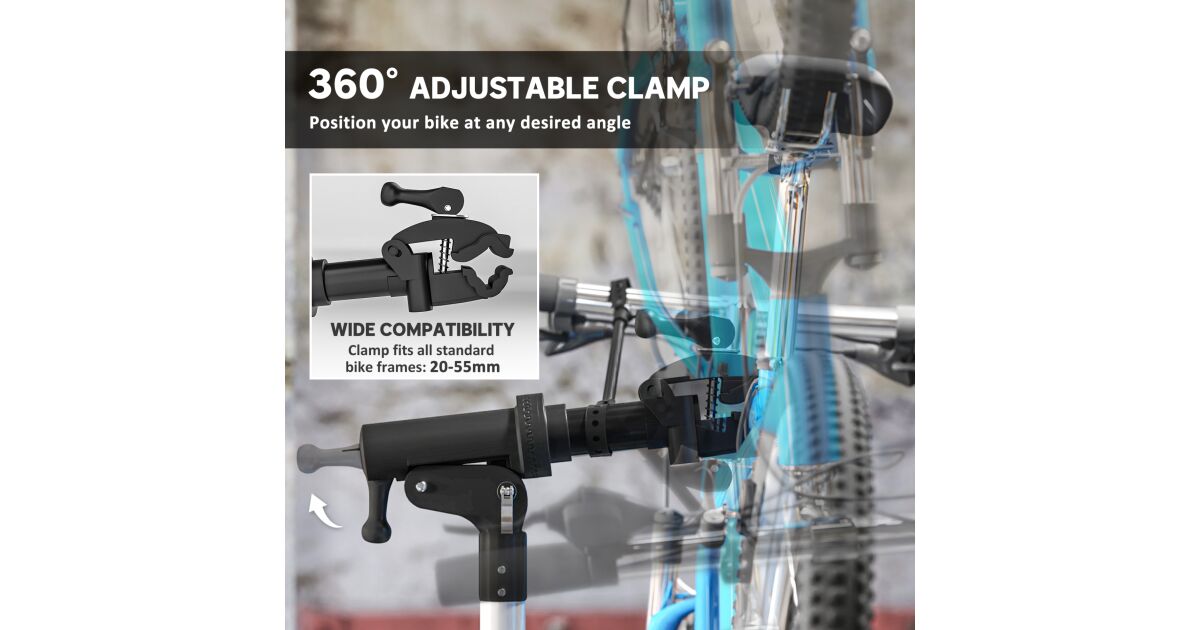 HOMCOM Kerékpárjavító Állvány Állítható Magassággal, 360°-ban Forgatható és Összecsukható, 82x106x107-160 cm, Fekete leírása
