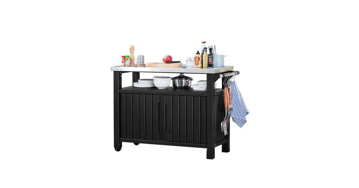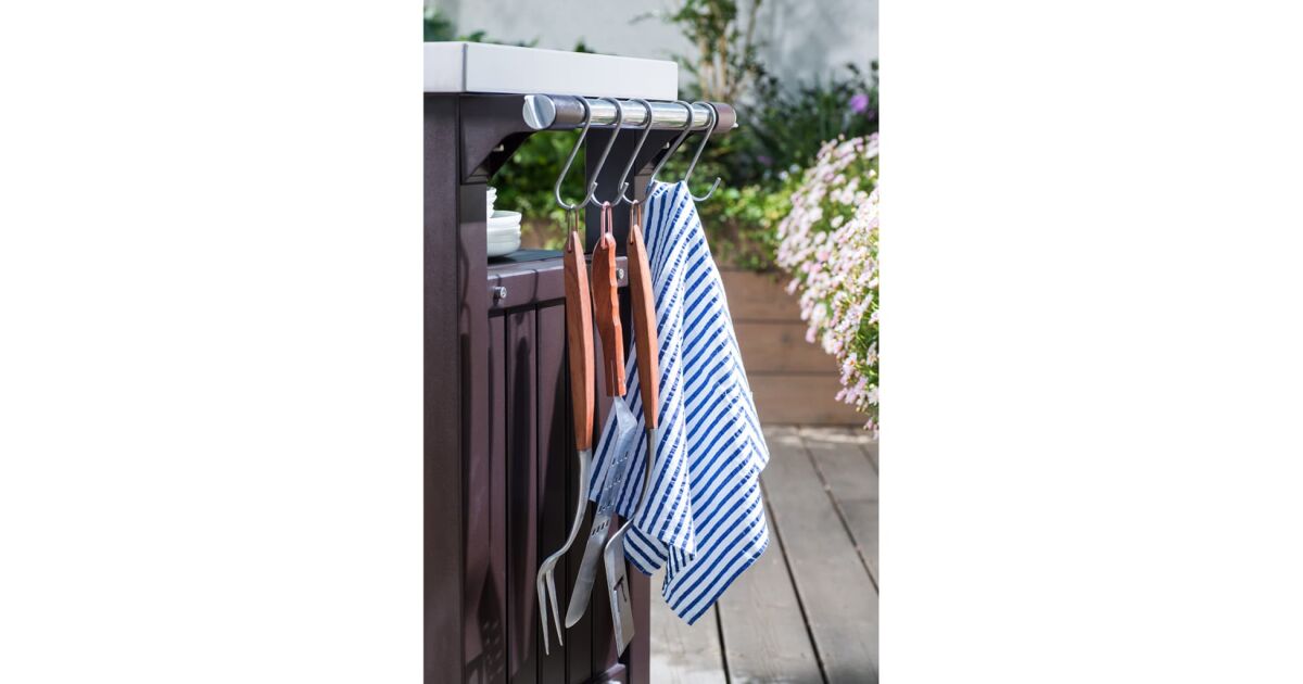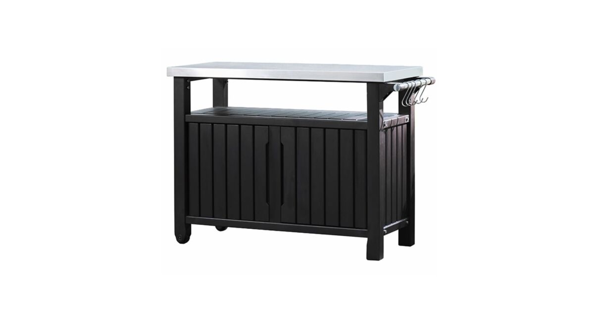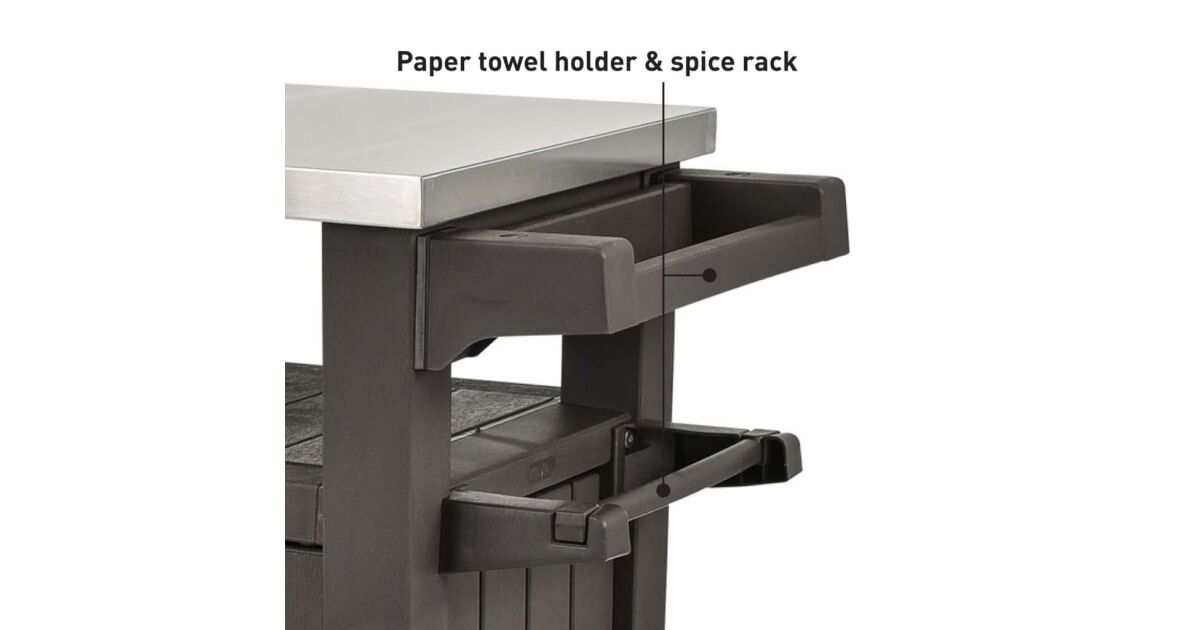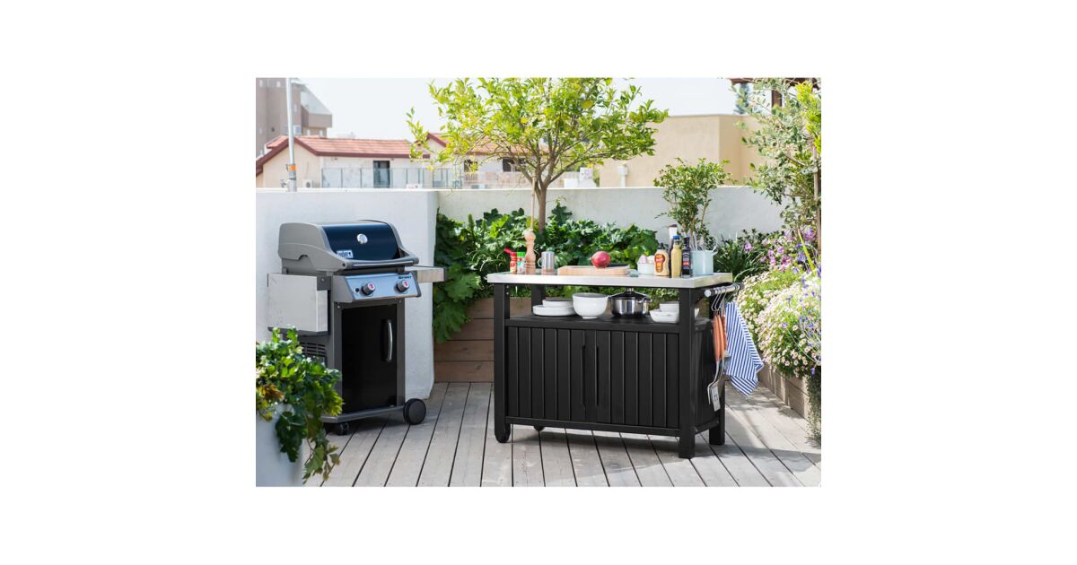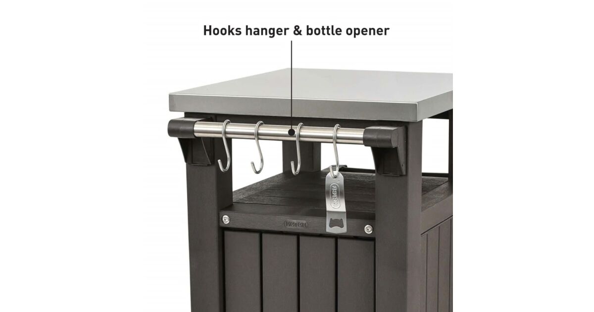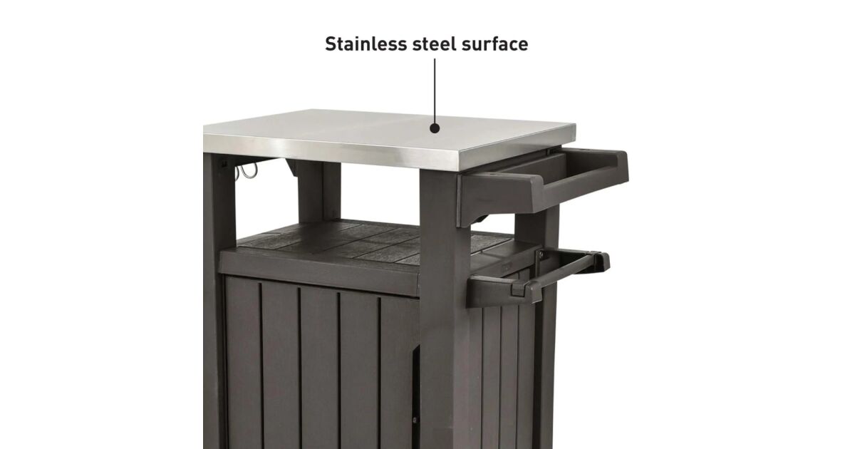 Ez a Keter Unity, grillezéshez szánt kültéri, multifunkciós asztal további 298 l tárolóhelyet rejt. Rozsdamentes acél munkalapja praktikus megoldást kínál ételek és italok elkészítéséhez és rengeteg extra tálalóhelyet biztosít, amikor grillpartit vagy szabadtéri bulit tartunk. Az asztal szilárd, időjárásálló anyagból készült, vonzó fautánzatú megjelenést kapott és rozsdamentes acél asztallappal lett ellátva, mely rendkívül könnyen tisztítható. 2 beépített görgőjének hála könnyen mozgatható. A szállítmány 4 akasztóhorgot és egy Keter palacknyitót is tartalmaz.Színe: grafitszürkeAnyaga: műanyag (PP), rozsdamentes acélMérete: 123,7 x 54 x 90 cm (Szé x Mé x Ma)Teljes tárolókapacitás: 298 LTárolási tárfogat lezárva: 207 literVonzó és elegáns műfa textúra2 görgővel a hordozhatóság érdekébenZárható tárolóhely (lakatot nem tartalmaz)Időjárásálló és nem igényel karbantartást Strapabíró asztallap ételek elkészítéséhez és tálalásáhozKönnyen összeszerelhetőA csomag tartalma:4 db akasztóhorog1 db palacknyitó