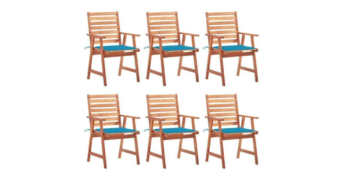 Élvezze a szabadtéri étkezést ezzel a 6 db elegáns akácfa étkezőszékkel, melyekhez puha, kék párnákat is adunk! A tömör akácfa időjárásálló és tartós, így hosszú éveken át szolgál majd. A rusztikus dizájn bármilyen kerti környezetbe remekül illeszkedik.