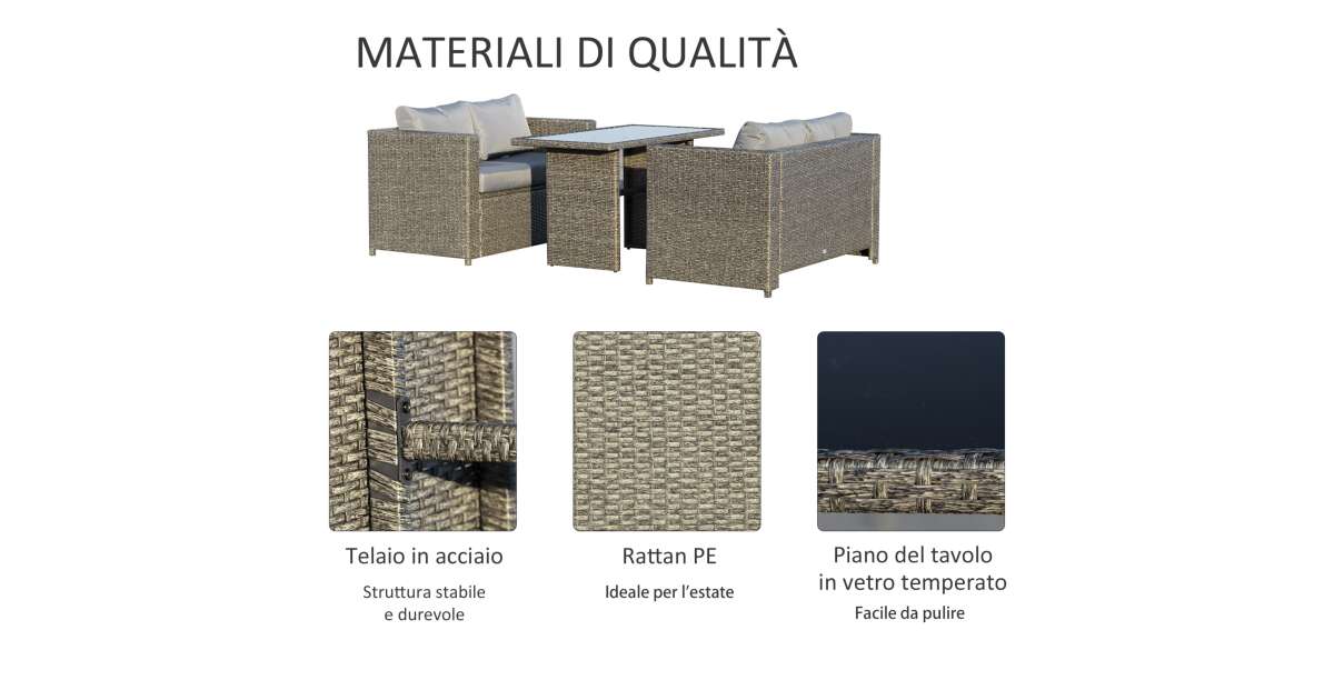 | Anyag | Acél, PE rattan, Poliészter, Edzett üveg |