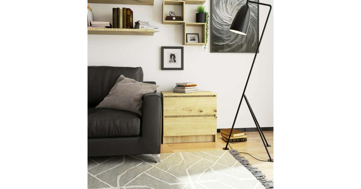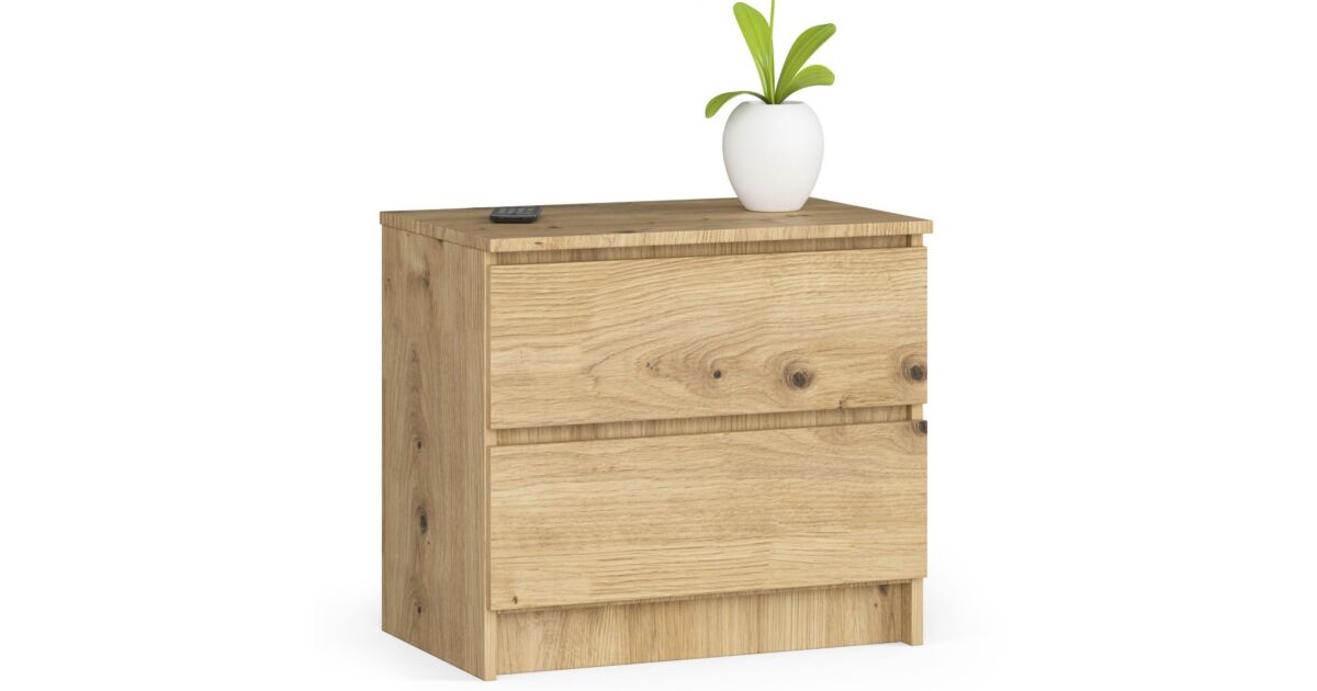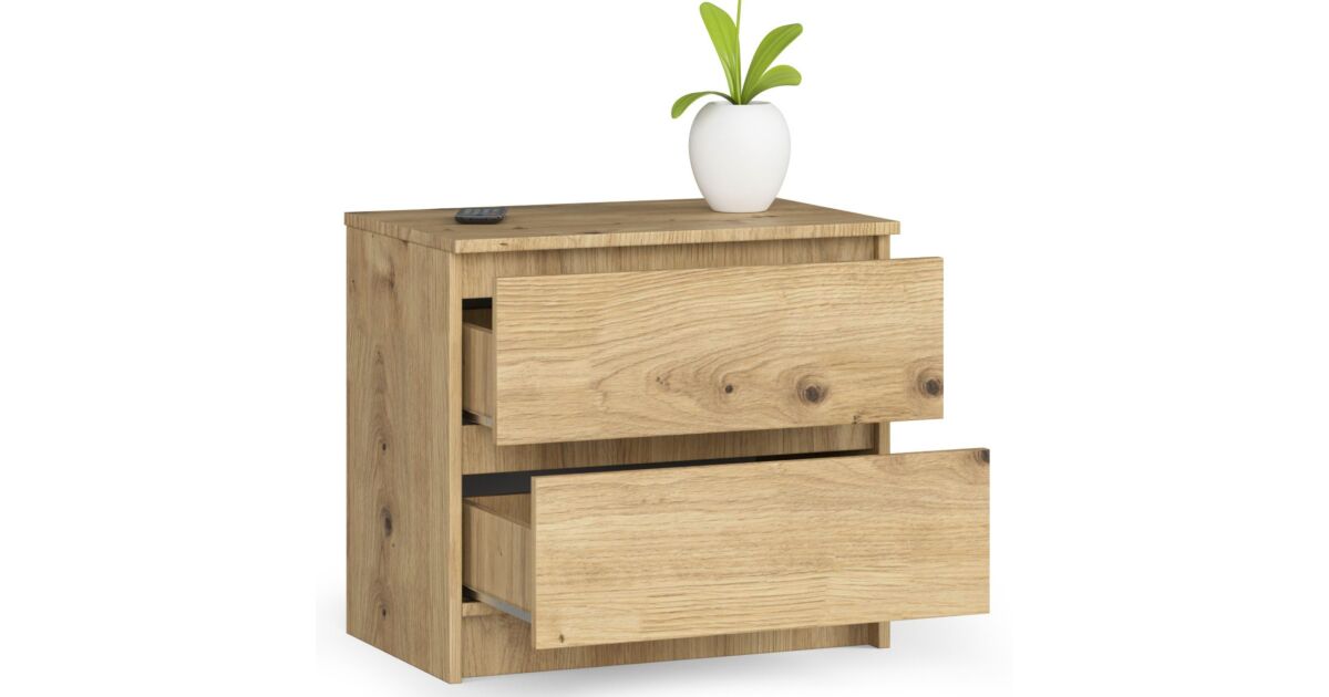 Ez a stílusos és praktikus 2 fiókos éjjeliszekrény tökéletes választás a hálószobába. Elegáns Artisan tölgy színével és kompakt méretével (60x55x40 cm) könnyen illeszkedik bármelyik berendezéshez. A két tágas fiók elegendő helyet biztosít az éjjeli lámpa, könyv, szemüveg és egyéb apróságok tárolására.