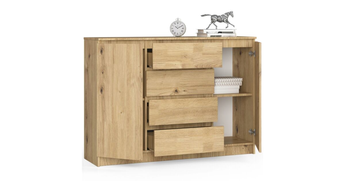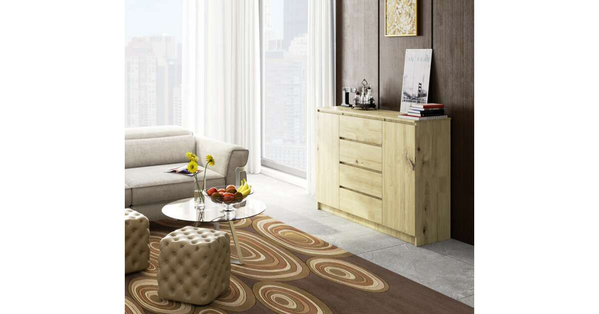 Ez a stílusos és praktikus komód elegáns tölgy Artisan kivitelben tökéletesen illeszkedik modern és rusztikus otthonokba egyaránt. Két tágas ajtóval és négy fiókkal rengeteg helyet biztosít a dolgaid tárolására. A minőségi anyagoknak és a gondos kidolgozásnak köszönhetően hosszú éveken át hű társad lesz.