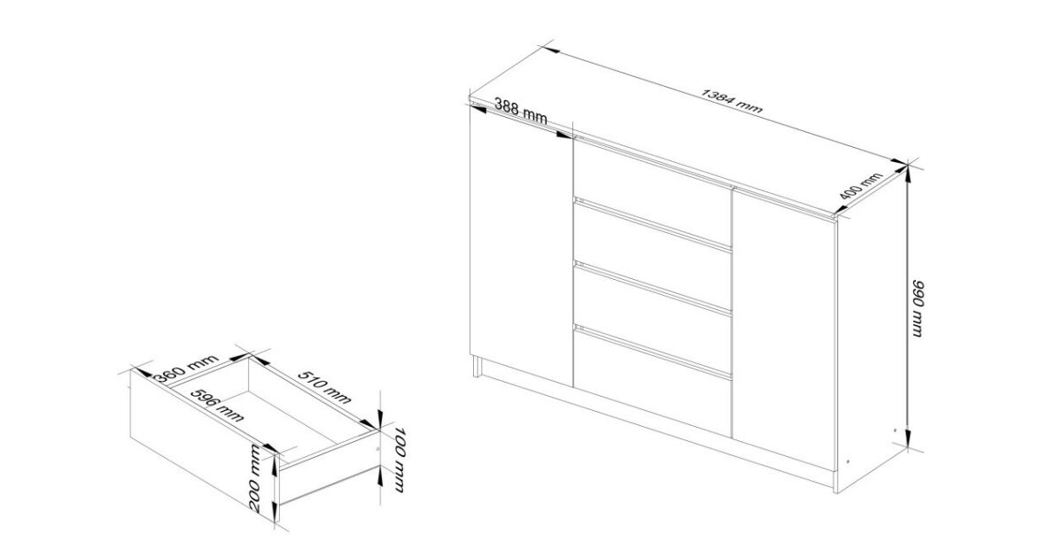 - Tökéletes tárolókapacitás: A két ajtó és a négy fiók elegendő helyet biztosít minden szükséges holmid számára.
