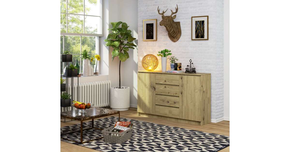Ez a tágas és stílusos AKORD komód tökéletes választás a nappaliba vagy hálószobába. Két tágas ajtóval és négy praktikus fiókkal rendelkezik, így rengeteg helyet biztosít a dolgaid tárolására. A minőségi Artisan tölgy furnér elegáns megjelenést kölcsönöz a bútornak, mely könnyen illeszkedik bármelyik otthoni stílushoz.
