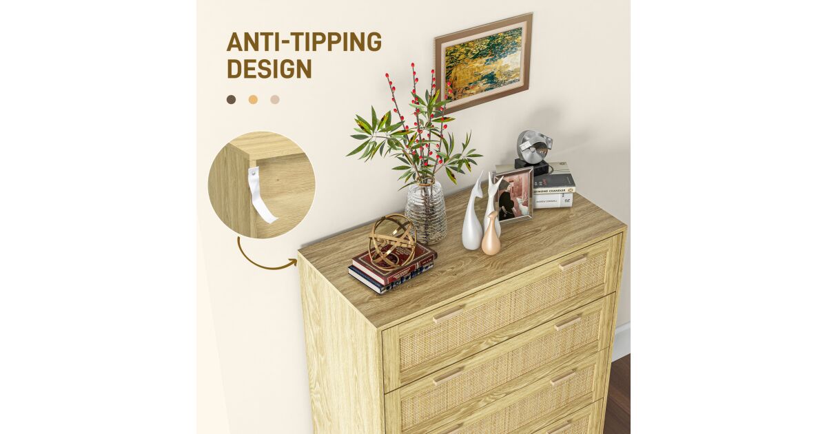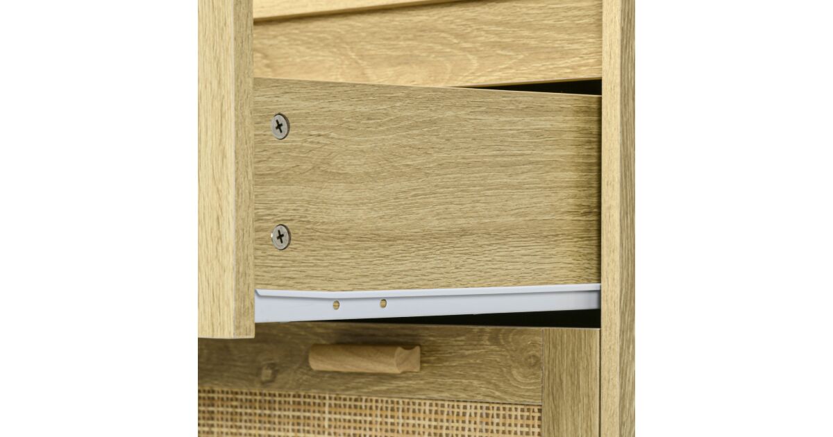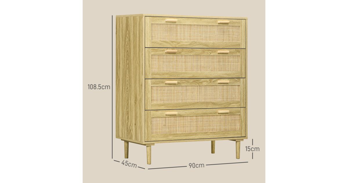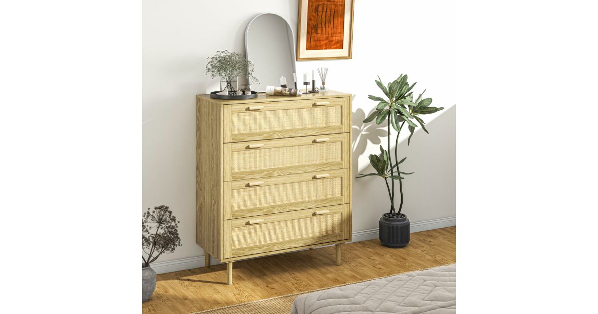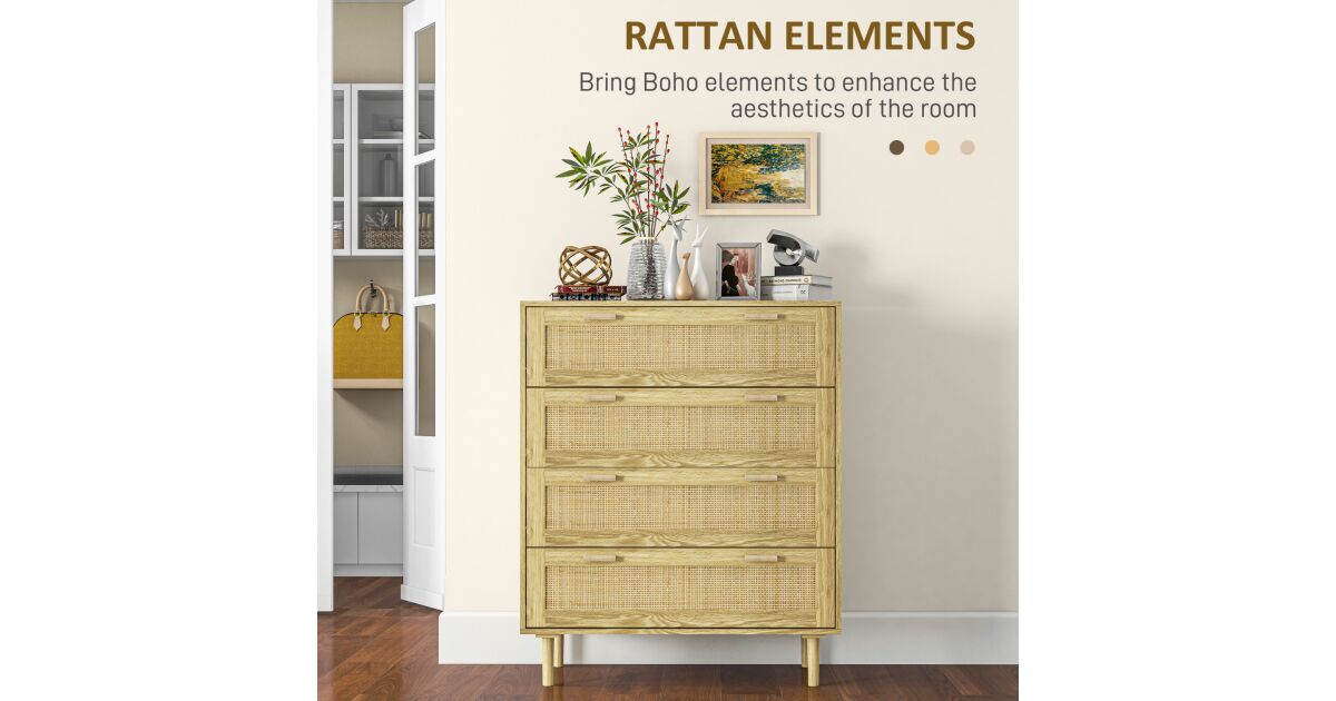 HOMCOM 4 fiókos komód bohém stílusban, fa és rattan fiókos komód hálószobába és előszobába, 90x45x108,5 cm, tölgyfa leírása