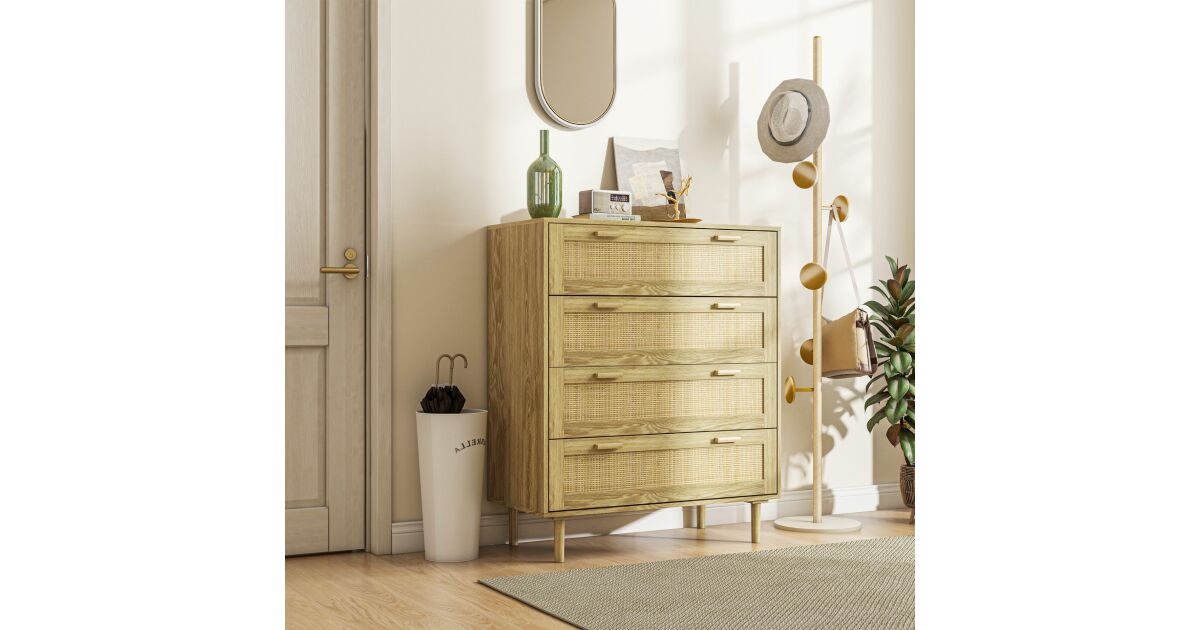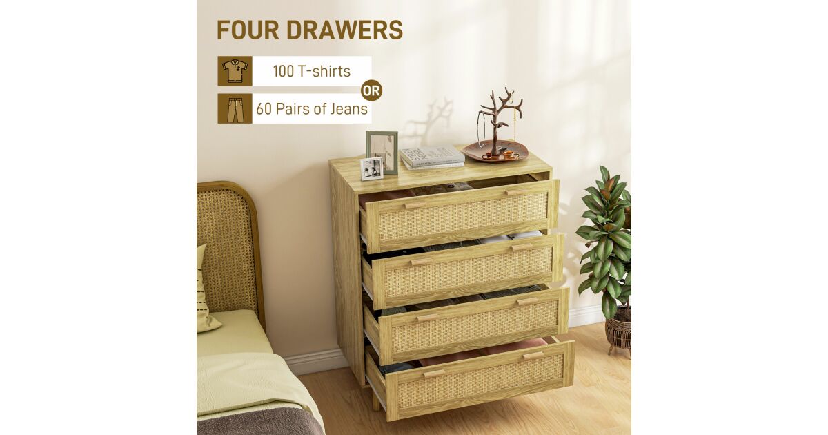 HOMCOM 4 fiókos komód bohém stílusban, fa és rattan fiókos komód hálószobába és előszobába, 90x45x108,5 cm, tölgyfa