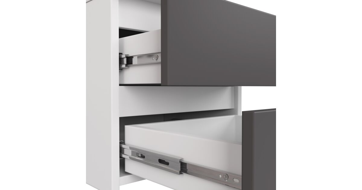 Ez a modern, fehér és grafitszürke komód tökéletes választás a nappaliba, hálószobába vagy akár a folyosóra is. Négy tágas fiókjával rengeteg helyet biztosít a dolgaid tárolására. A minőségi laminált lapból készült komód kopásálló és könnyen tisztítható. A fiókok fém görgős csúszdákon mozognak, így sima és halk a nyitás és zárás.