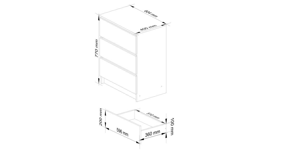 Ez a stílusos és praktikus 3 fiókos komód tökéletes választás a nappaliba, hálószobába vagy akár a gyerekszobába is. 16 mm-es laminált lapból készült, kopásálló és könnyen tisztítható felülettel rendelkezik. Az ABS szegélyek extra védelmet biztosítanak a sérülések ellen.