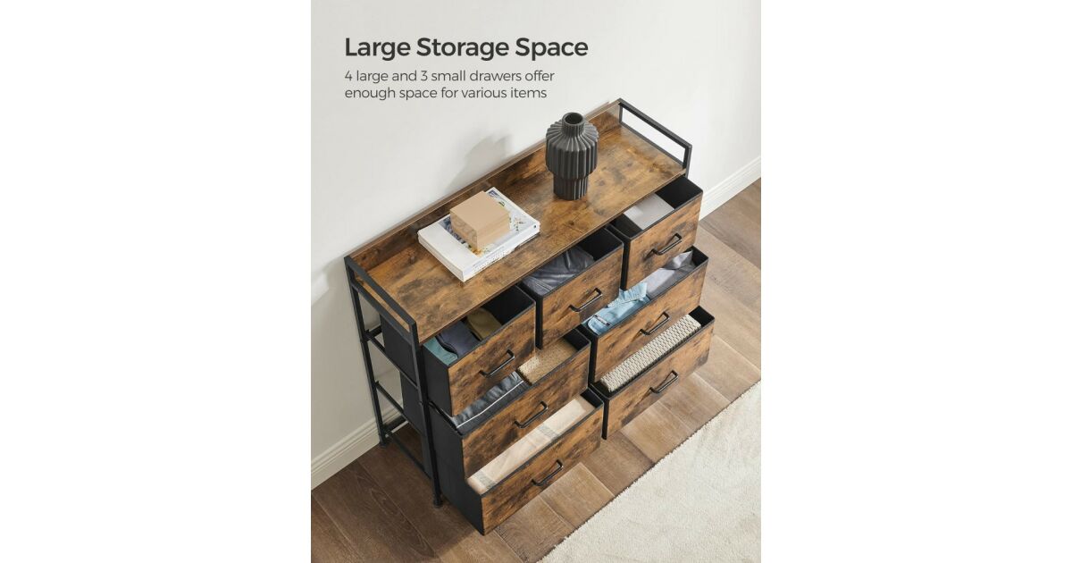 Ez a tágas, 7 fiókos komód segít megszabadulni a rendetlenségtől és stílusosan tárolni ruháit, apró tárgyait. Ipari formatervezéssel és rusztikus barna színével otthonának meleg, személyre szabott hangulatot kölcsönöz. ✨