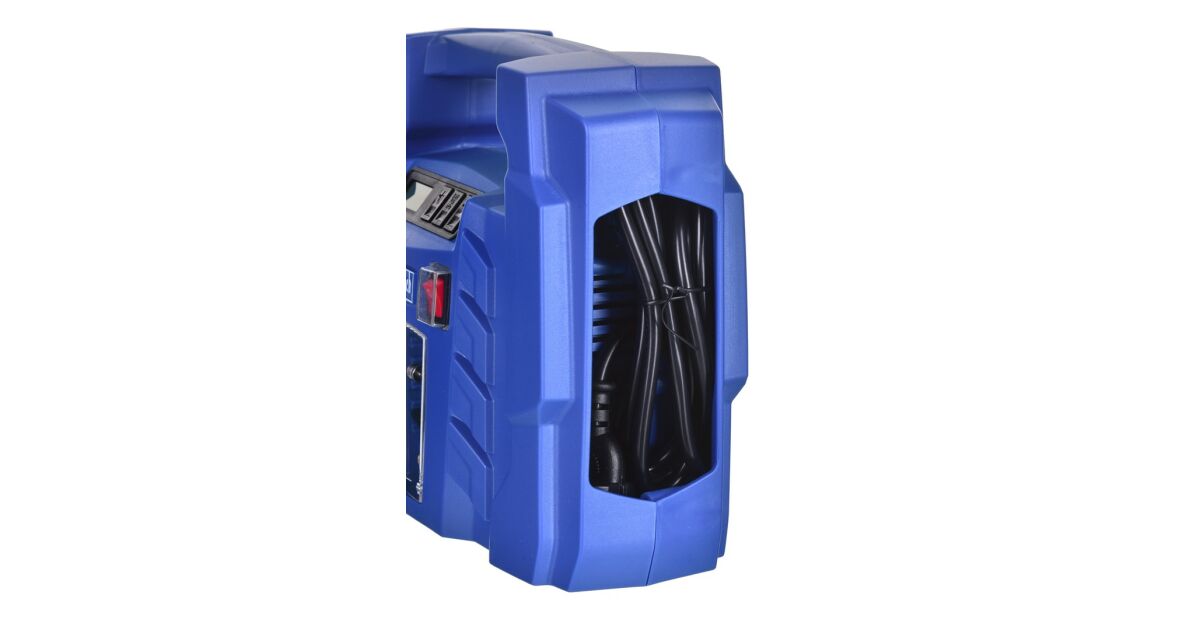 - Beépített tároló: A kábelek és a 0,6 m-es levegőtömlő biztonságosan tárolható a készülékben.