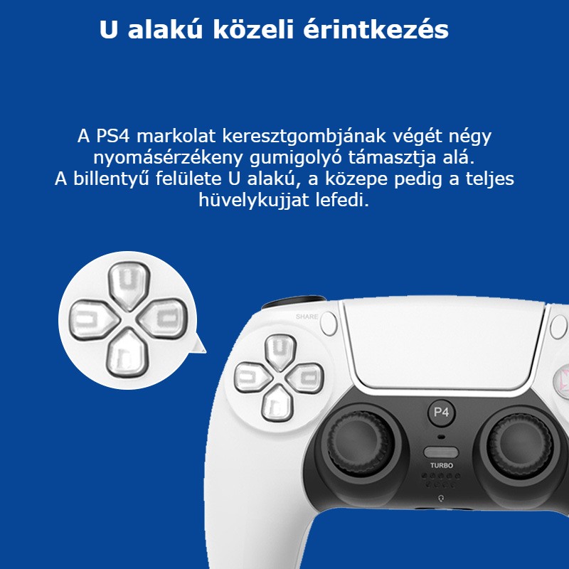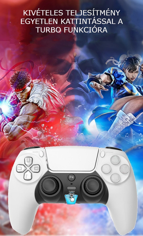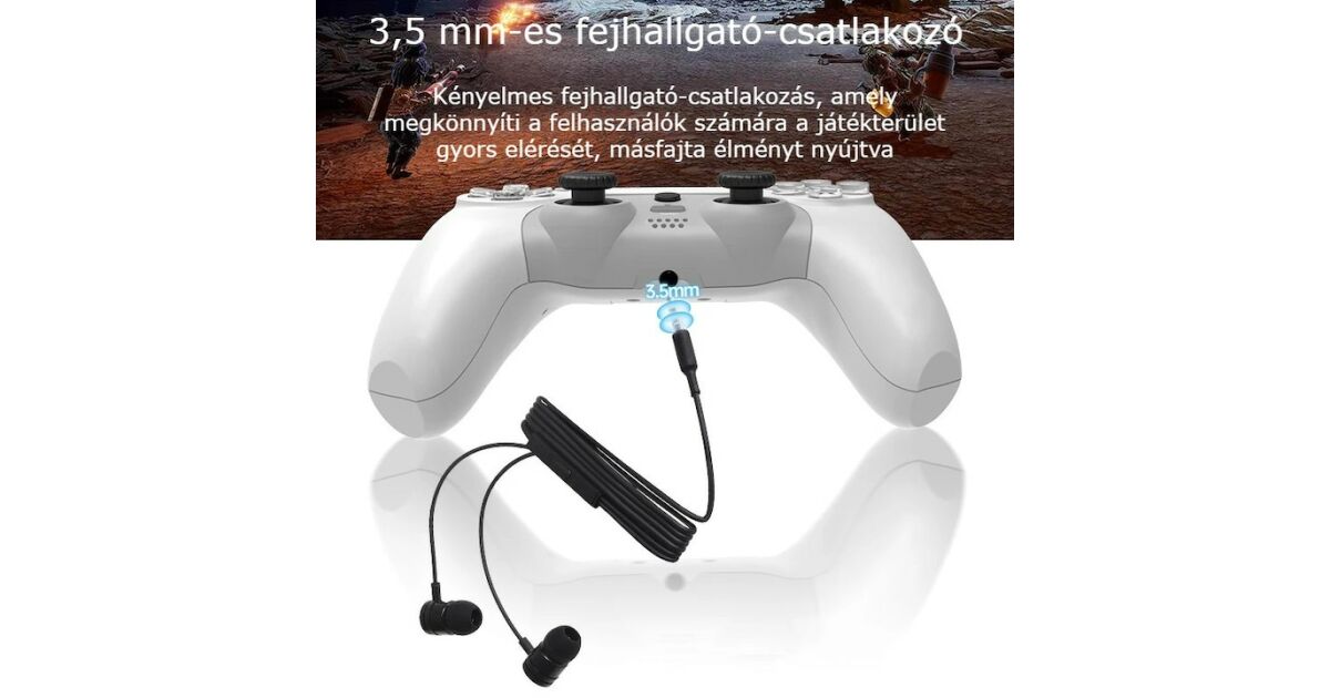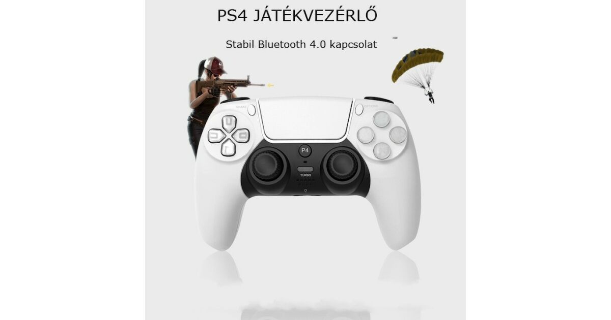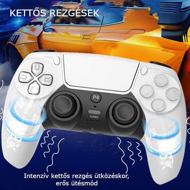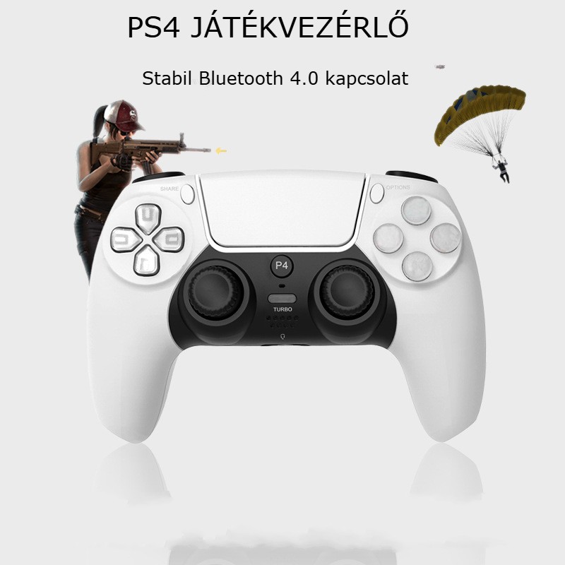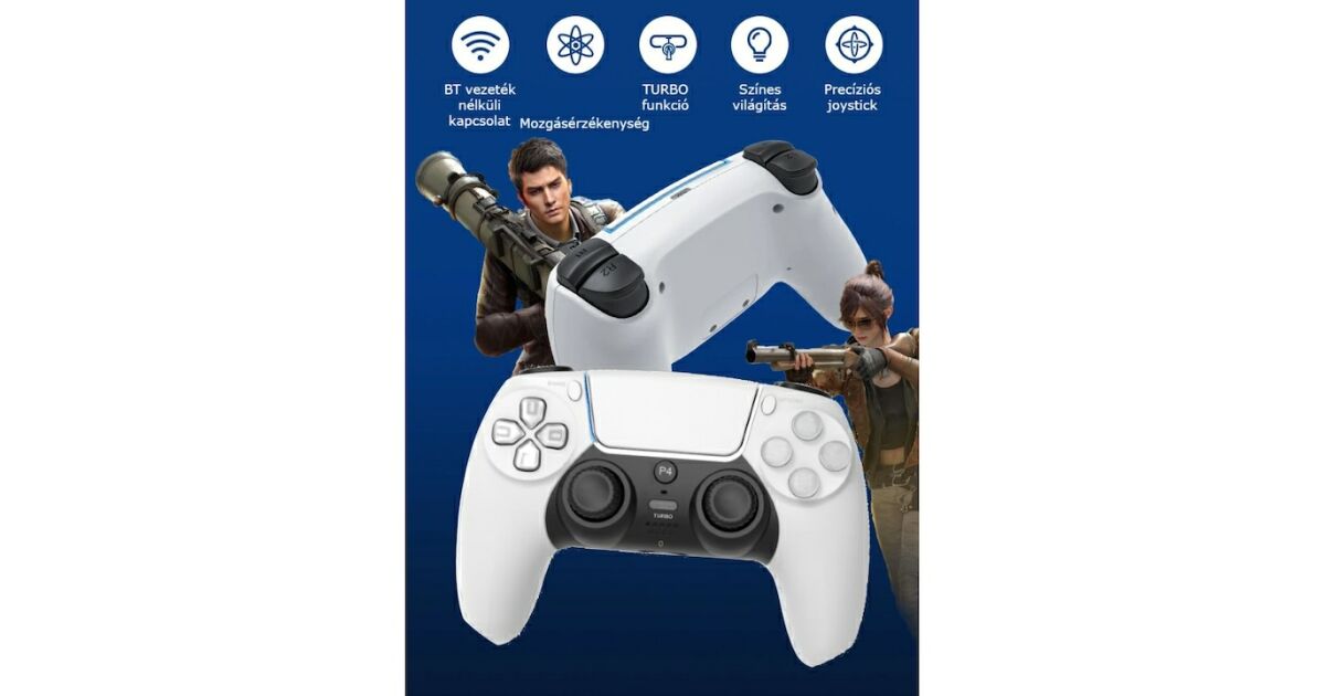 Vezeték nélküli PS4 kontroller, fehér, turbó funkció, 800 mAh akkumulátor-üzemidő, kettős vibrációs rendszer, 350 g, megvilágított gombok leírása