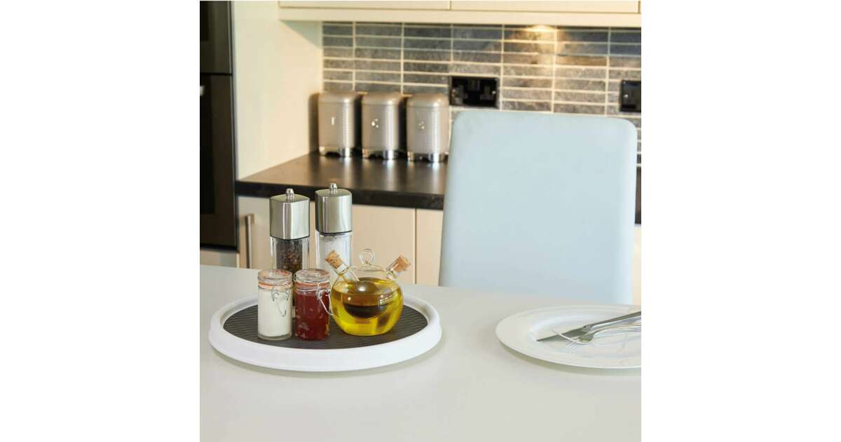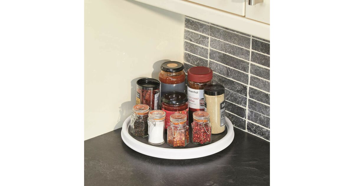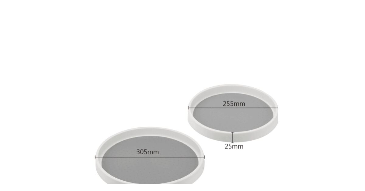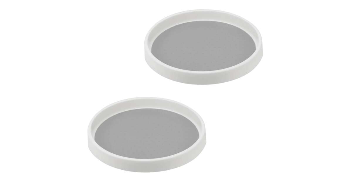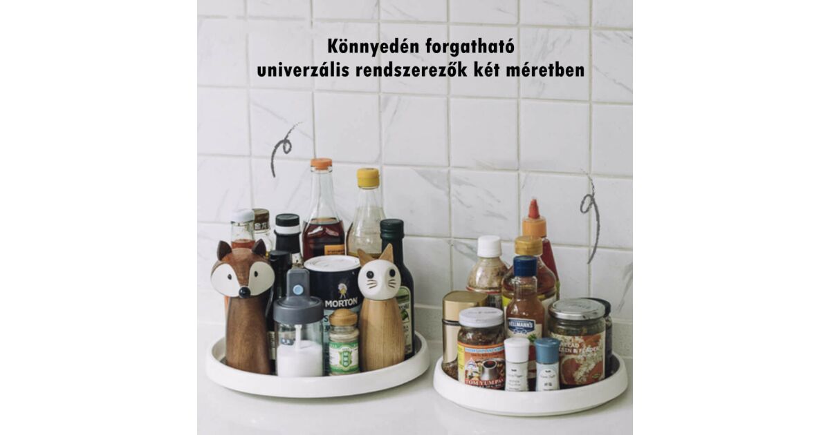 Két darab 30 cm átmérőjű, forgatható tárolóval könnyedén rendet teremthetsz a szekrényekben és polcokon. Ideális fűszerekhez, italokhoz, gyógyszerekhez, tisztítószerekhez, vagy bármilyen apró tárgyak tárolásához.
