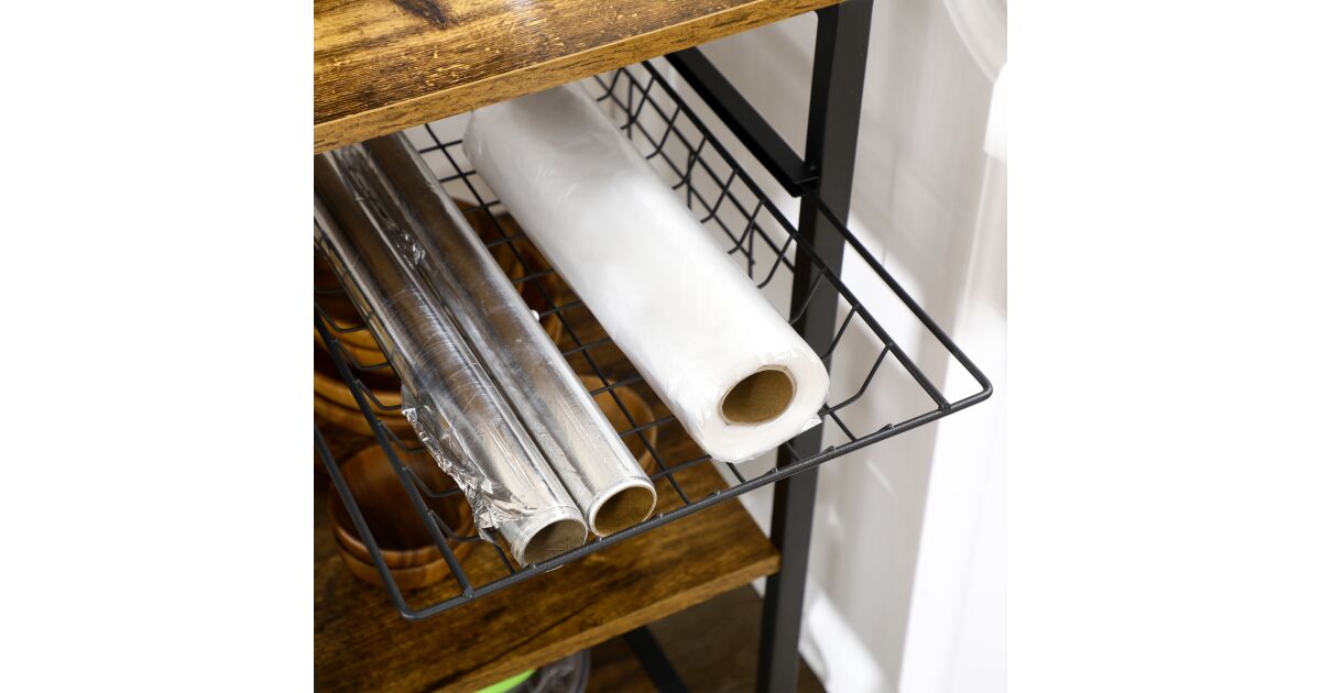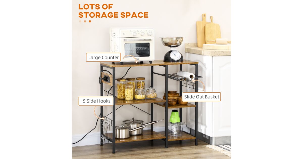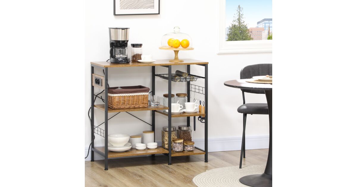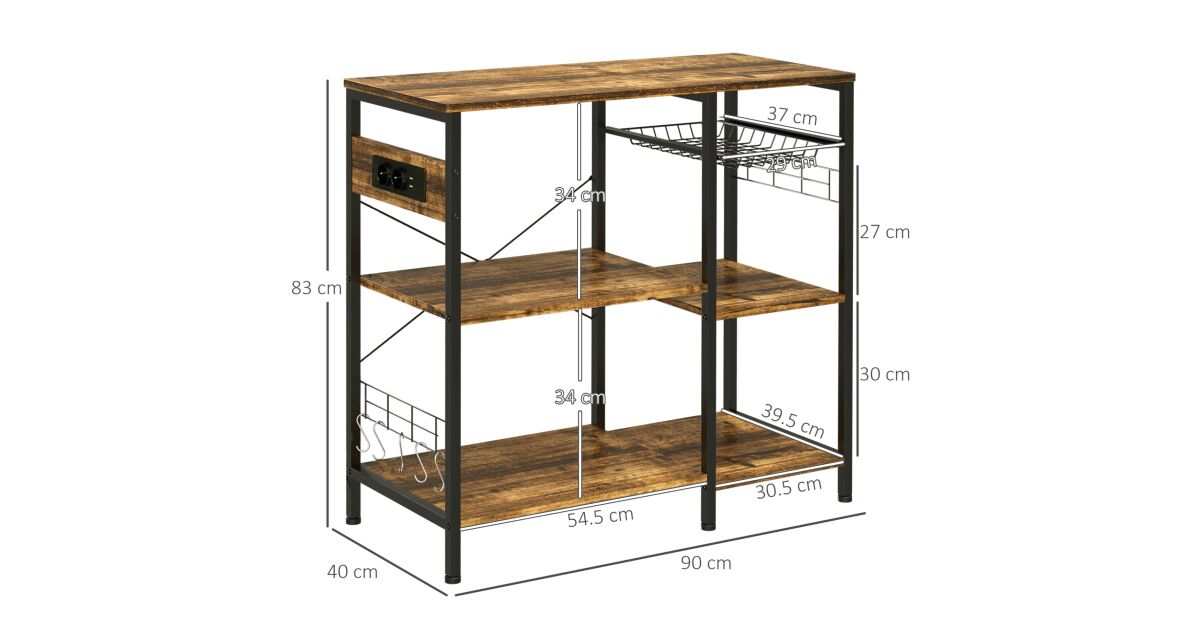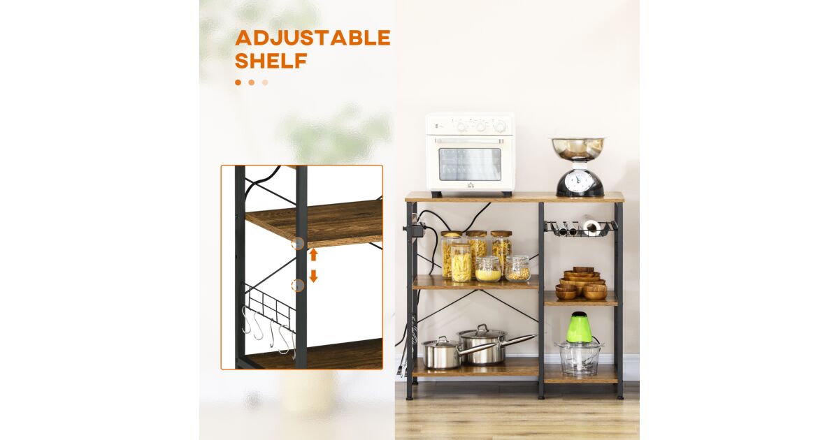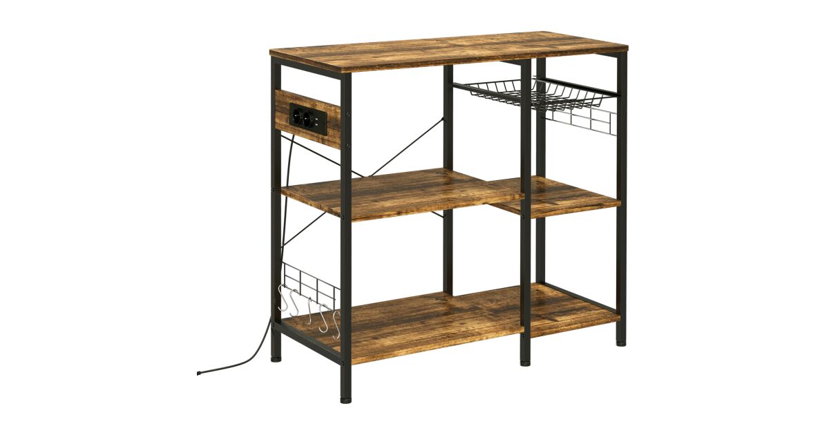 Ezt a terméket így is ismerheted: HOMCOM Péksüteményes állvány konnektorral, USB töltővel, mikrohullámú sütő tartóval, kávézó, ipari konyhai polcok kosárral, 5 S alakú kampóval fűszerekhez, edényekhez és serpenyőkhöz, barna