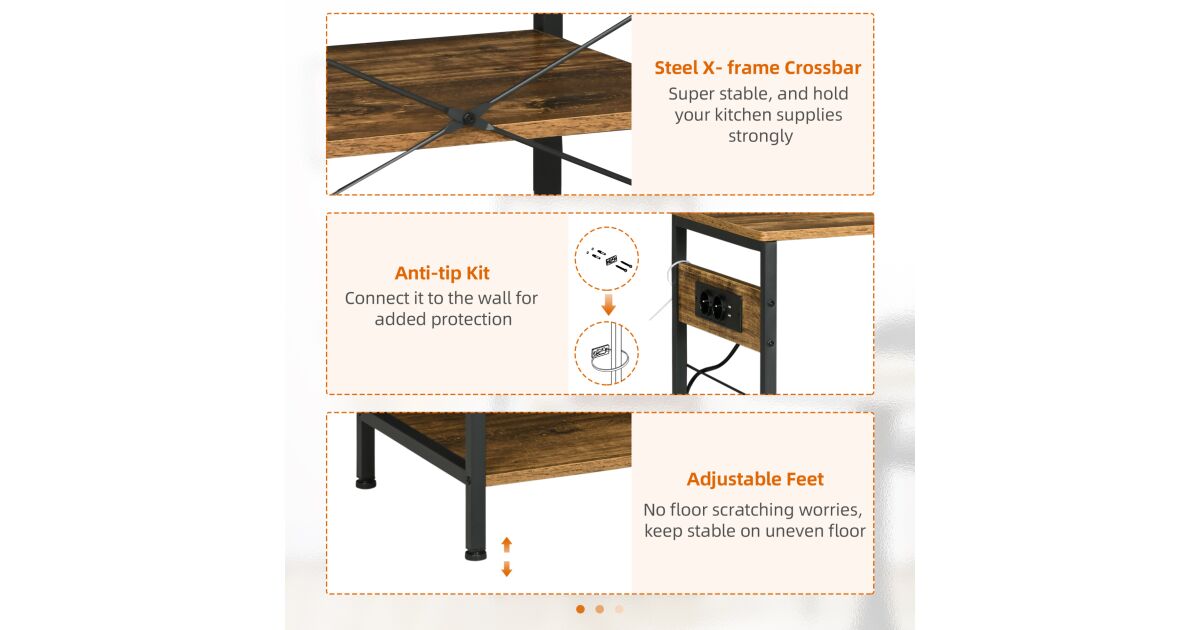 HOMCOM Péksüteményes állvány konnektorral, USB töltővel, mikrohullámú sütő tartóval, kávézó, ipari konyhai polcok kosárral, 5 S alakú kampóval fűszerekhez, edényekhez és serpenyőkhöz, barna vélemények