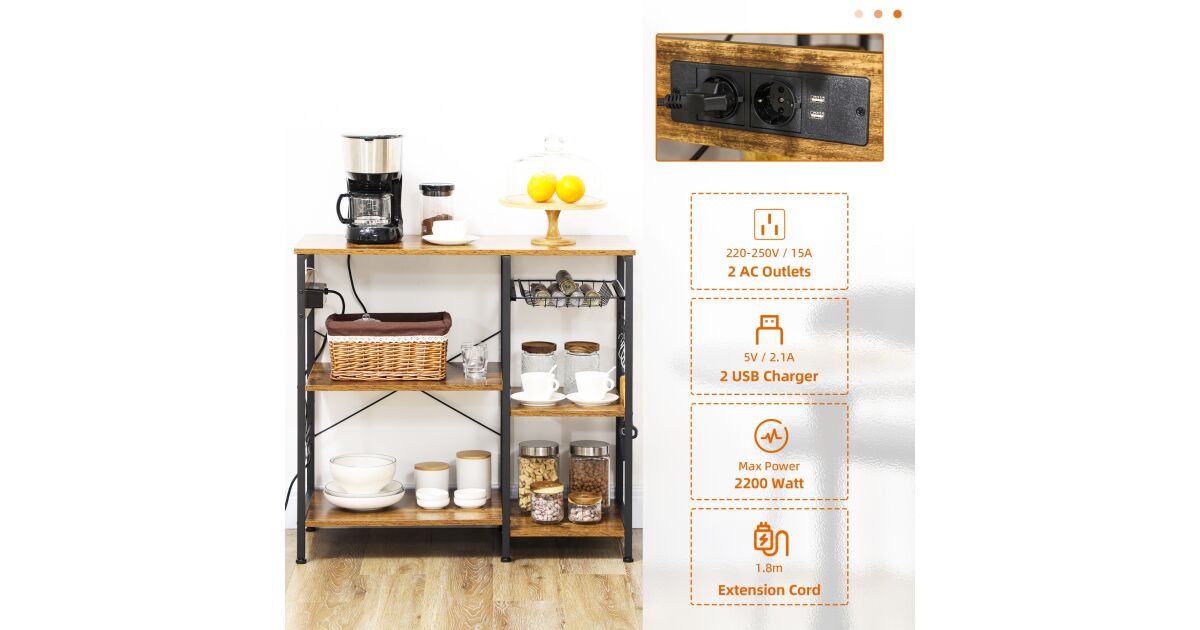 HOMCOM Ipari Stílusú Konyhai Polc Konnektorokkal és USB Töltővel ⚡
