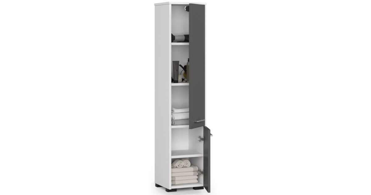 Ezt a terméket így is ismerheted: Fürdőszobaszekrény 2 ajtóval és 4 belső polccal, 16 mm-es laminált forgácslap, 30x30x140 cm, fehér/szürke