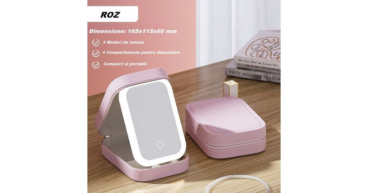 Pénztárca, KeepHome, Kozmetikai táska, LED tükörrel, 3 világítási mód, USB töltés, 1200 mAh akkumulátor, kozmetikumok rendszerezéséhez, 4 rekeszes, műbőr, rózsaszín, 16,5x11,5x6 cm leírása