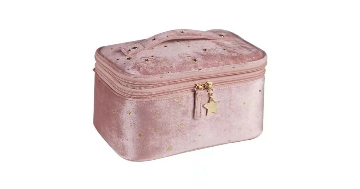 Ez a rózsaszín, velúr anyagból készült, csillag motívumokkal díszített kozmetikai táska tökéletes választás minden modern nő számára, aki szereti a stílust és a praktikusságot utazásai során. 💖