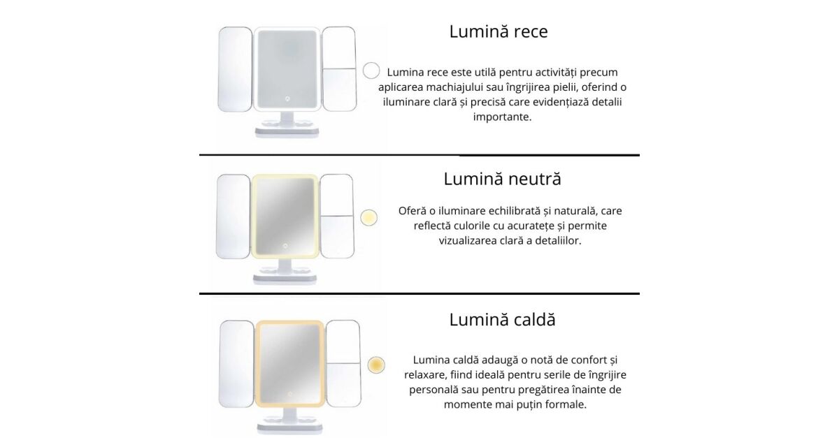 - 💡 Állítható LED Világítás: 3 fénybeállítás (hideg, meleg, természetes fény) a tökéletes megvilágításhoz.