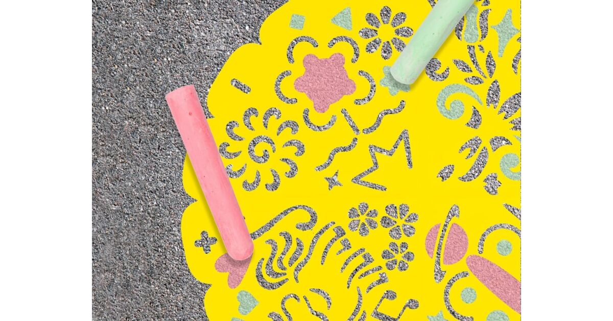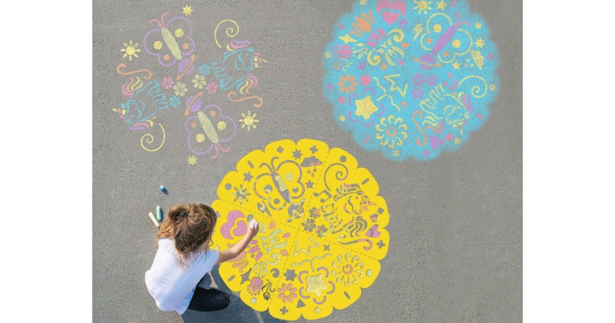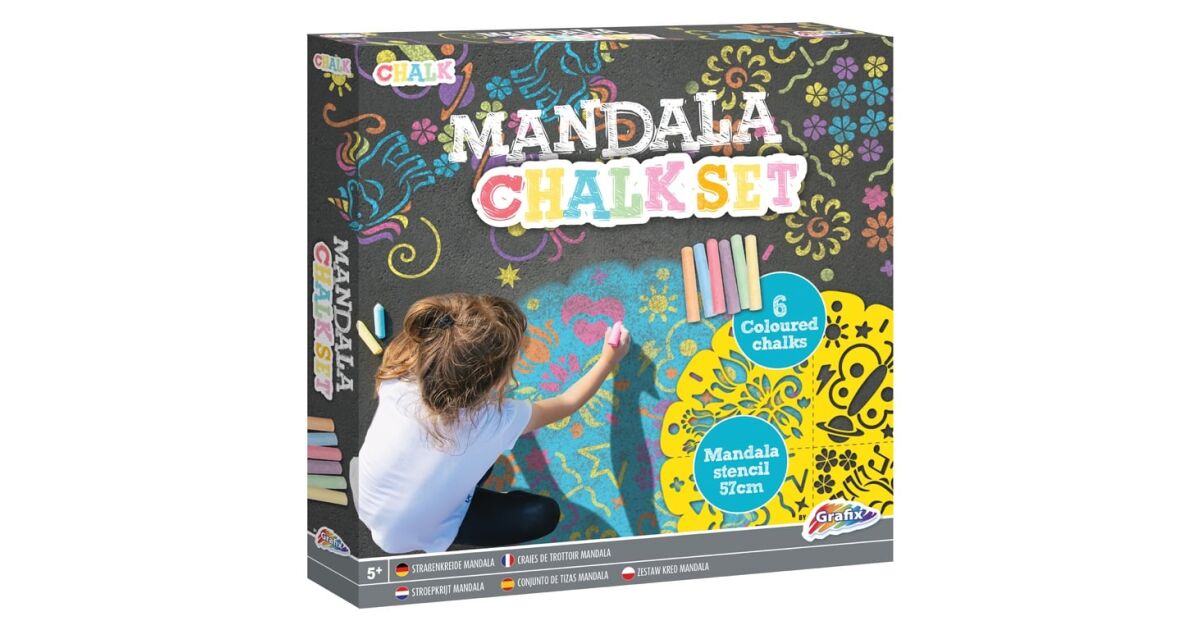 Készíts lenyűgöző, óriási mandalákat az aszfaltra ezzel a szórakoztató készlettel! A Grafix 57 cm átmérőjű, újrafelhasználható sablonjával és 6 élénk színű aszfaltkrétájával könnyedén alkothatsz csodálatos műveket.